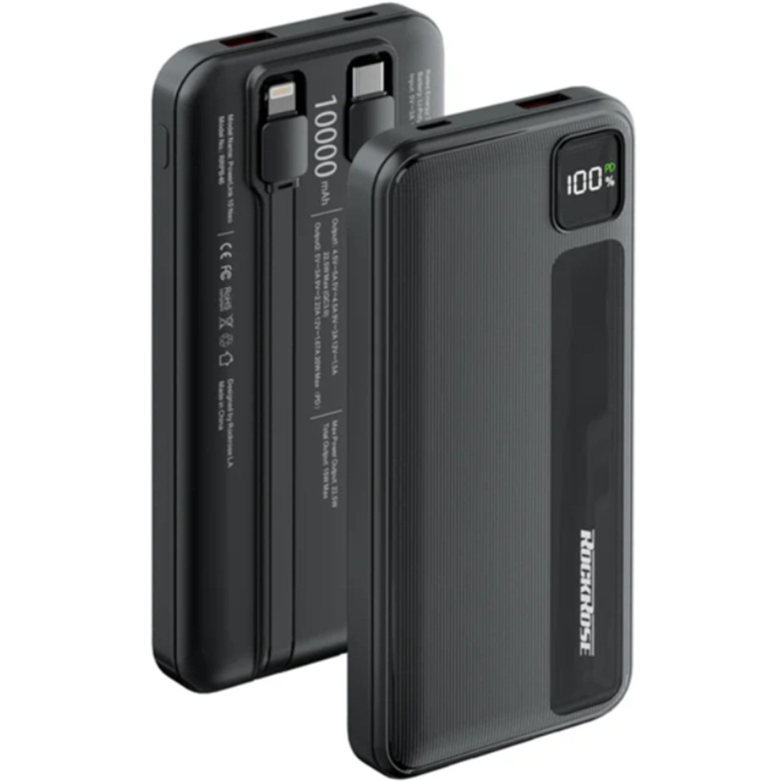 RockRose Powerlink 10 Neo 10000mAh Power Bank - Black QC 3.0 20W PD & 22.5W Quick Charge - Embedded with USB-C & Lightning 20W Quick Charge Cable