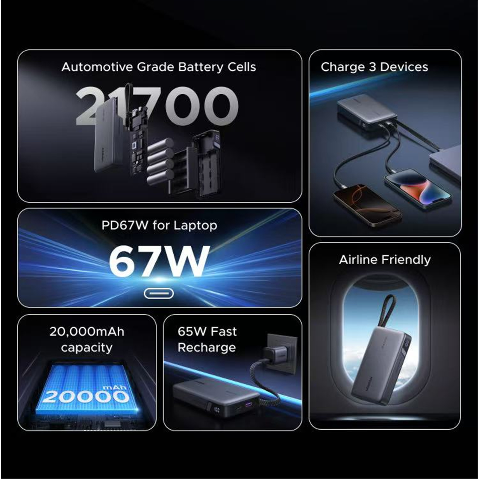 UGREEN 20000mAh 67W Power Bank with Built-in USB-C Cable