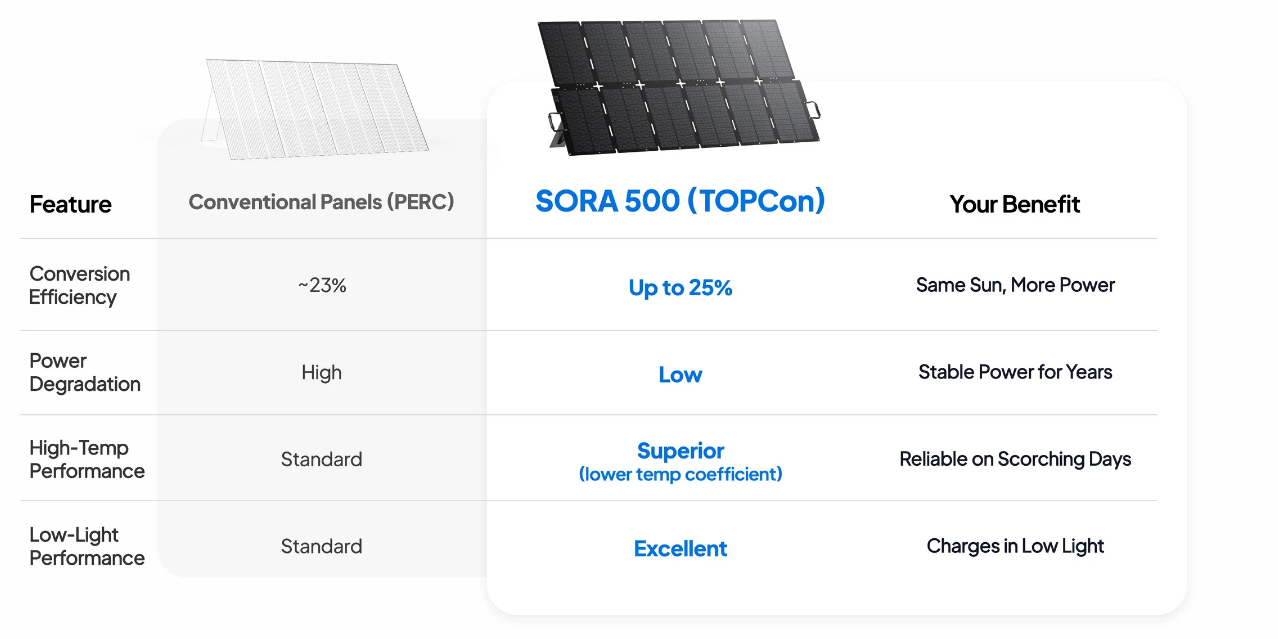 SORA 500 captures more sunlight, lasts longer, and performs better in extreme conditions. Don't settle for yesterday's technology.
