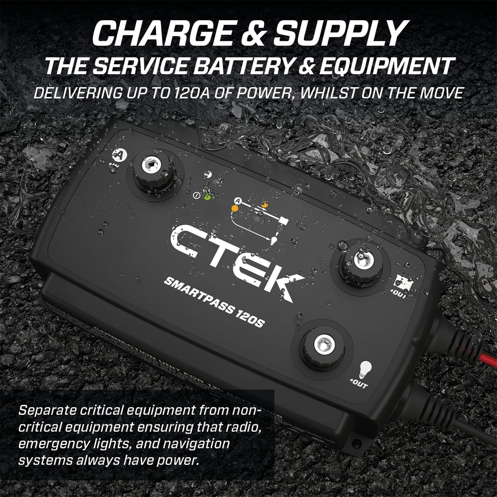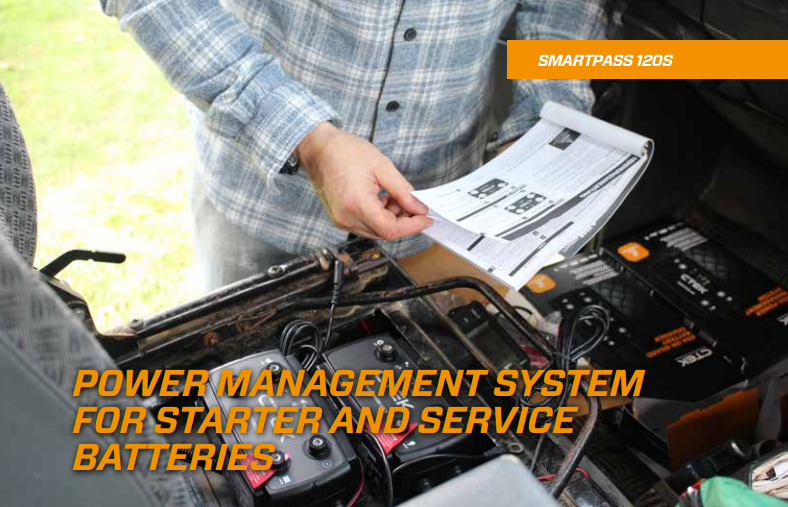 SMARTPASS 120S charges and supplies the service battery and equipment with 120A, separate critical equipment from non-critical equipment ensuring that radio, emergency lights, and navigation systems always have power. SEPARATE, PRIORITIZE AND BOOST BATTERIES AND EQUIPMENT SMARTPASS 120S is a 120A Power Management Solution which distributes, controls and maximizes the available energy from your alternator to power service batteries and consumers. SMARTPASS 120S handles all 12V batteries between 28-800Ah. The SMARTPASS 120S's Battery Guard function ensures that critical equipment such as radio, emergency lights and navigation systems always have power and take priority when the voltage on the service battery is low disconnecting non-critical consumers. The unit's Battery Guard will protect your service battery from total discharge and built-in over-temperature protection reduces charge current before the battery temperature gets too high. SMARTPASS 120S is compatible with the D250SA and D250SE 20A onboard chargers.