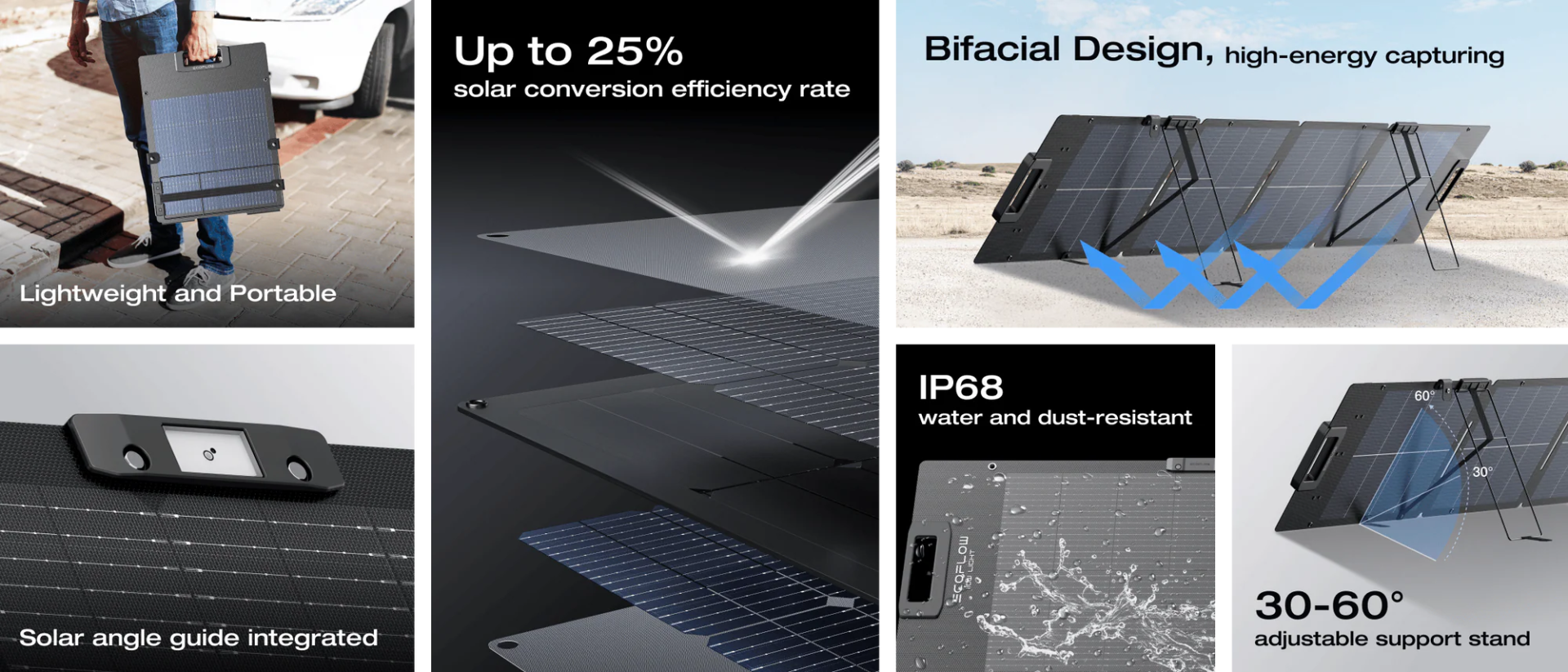 - 30-60° adjustable support stand and integrated solar angle guide
