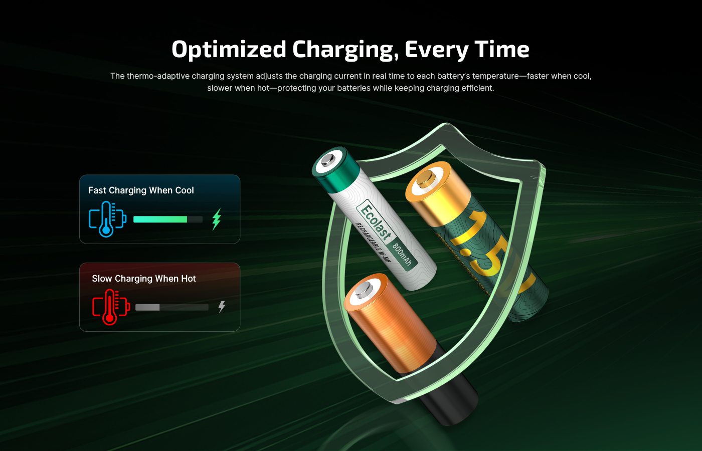 - Broad Compatibility, Polarity-Free: Supports any brand of AA and AAA Ni-MH batteries, plus our Ecolast 1.5V AA rechargeable Li-ion batteries. Drop cells in any direction-no (+)/(-) alignment needed.