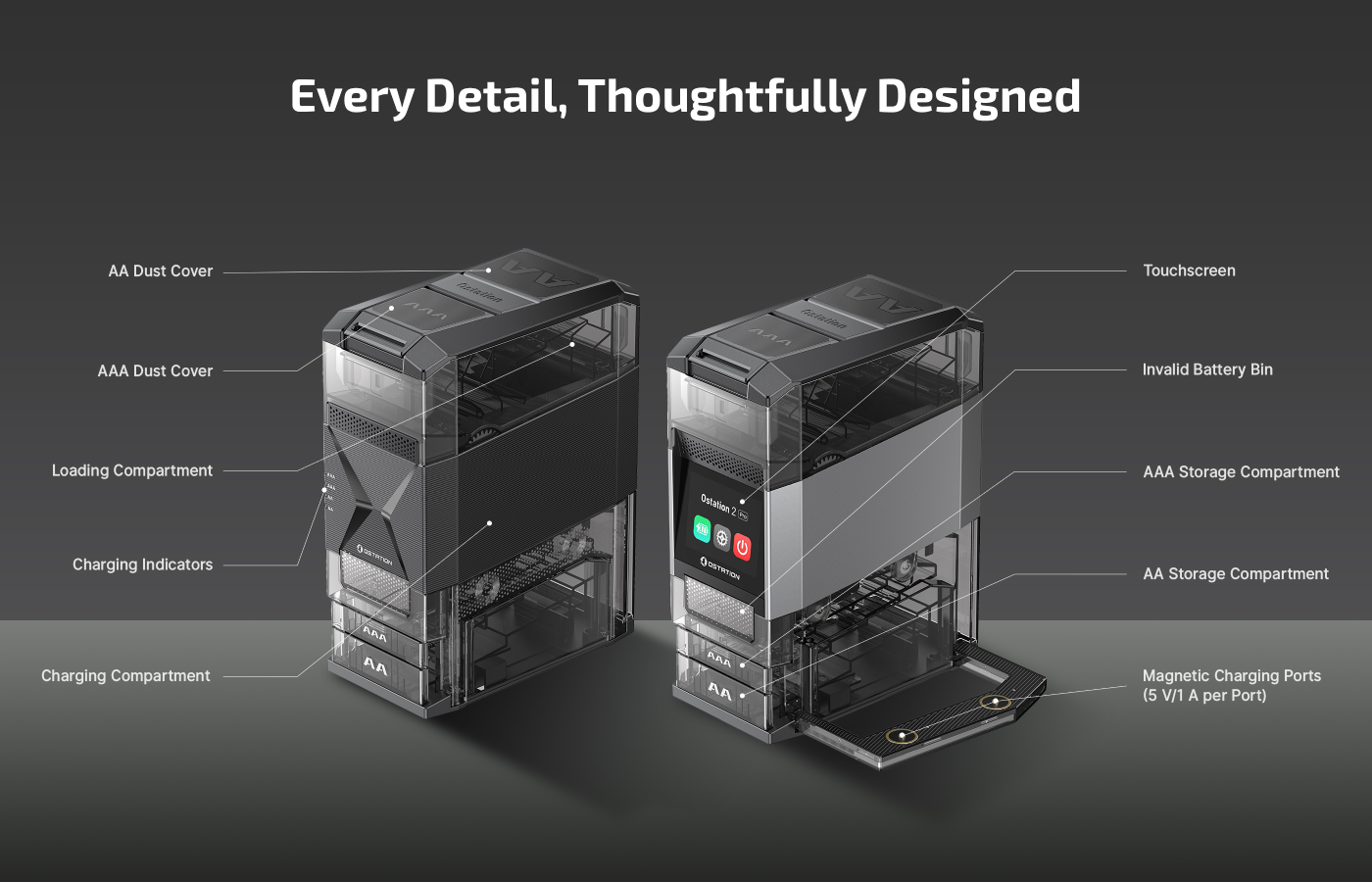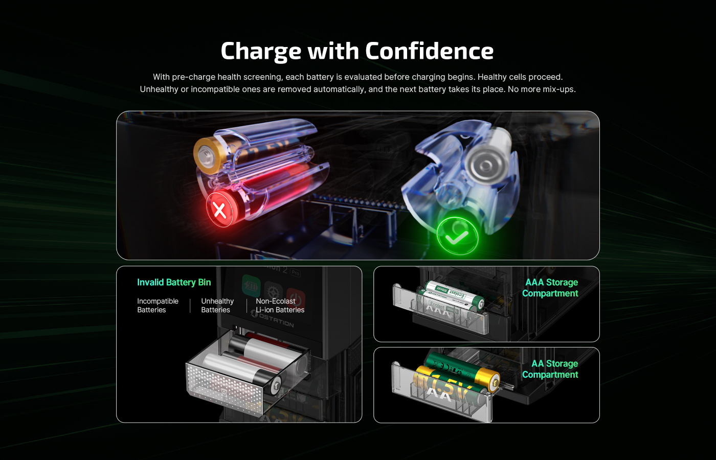 - Auto-Detect, Charge & Sort: Leading-edge per-cell management system checks each battery before charging. Only healthy batteries charge, while incompatible or unhealthy cells are automatically removed. Saves time and prevents mix-ups.