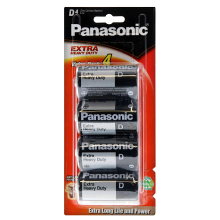 Panasonic Extra Heavy Duty Carbon Zinc Batteries provide an economical power source for low-drain devices. They deliver a stable, continuous supply of small amounts of power, making them an ideal choice for products that don't draw a lot of power such as radios, remote controls, wall clocks, LED torches and battery.