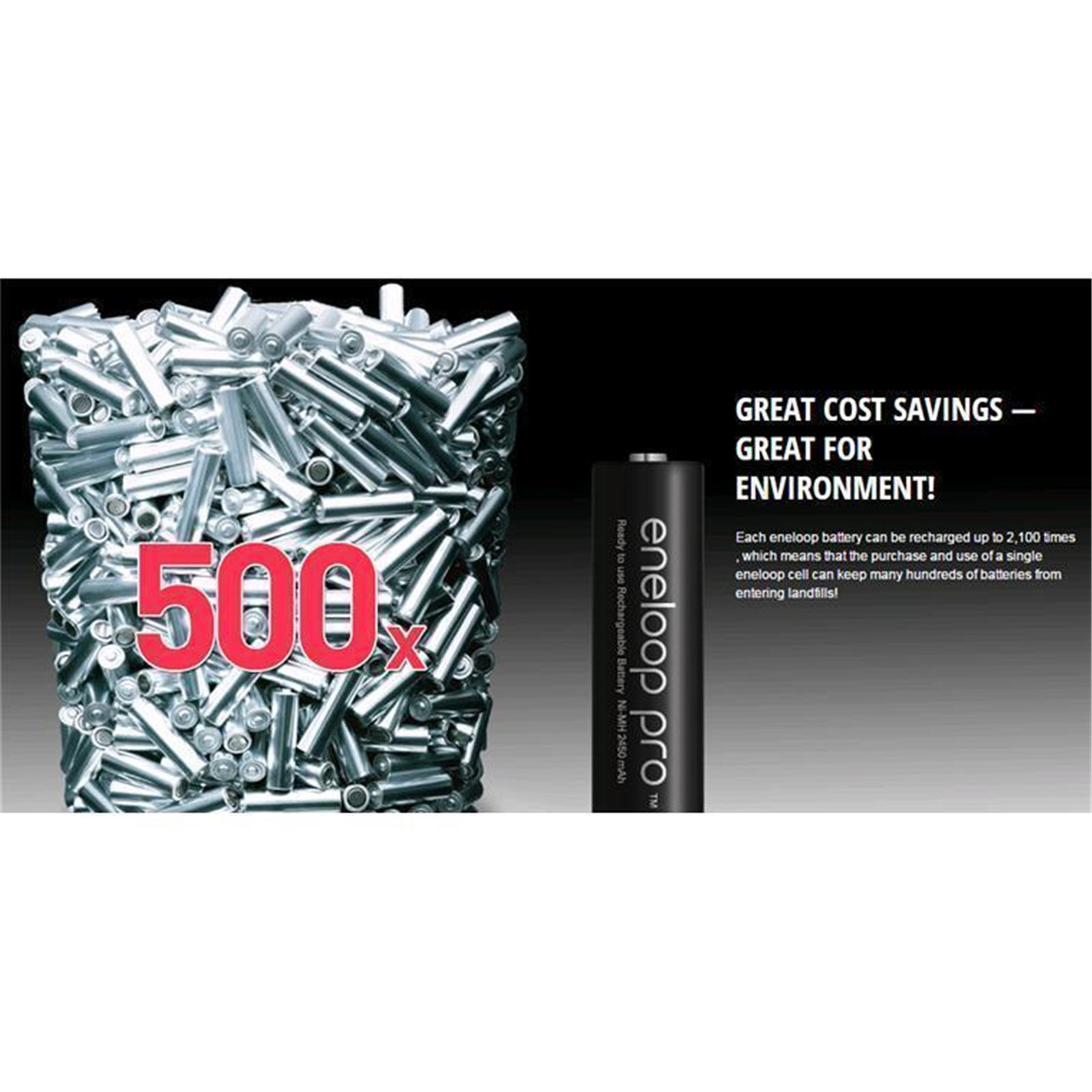 Each eneloop battery can be recharged up to 500 times , which means that the purchase and use of a single eneloop cell can keep many hundreds of batteries from entering landfills!