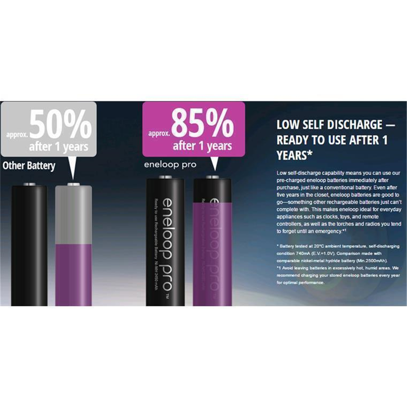 *1 Avoid leaving batteries in excessively hot, humid areas. We recommend charging your stored eneloop batteries every year for optimal performance.