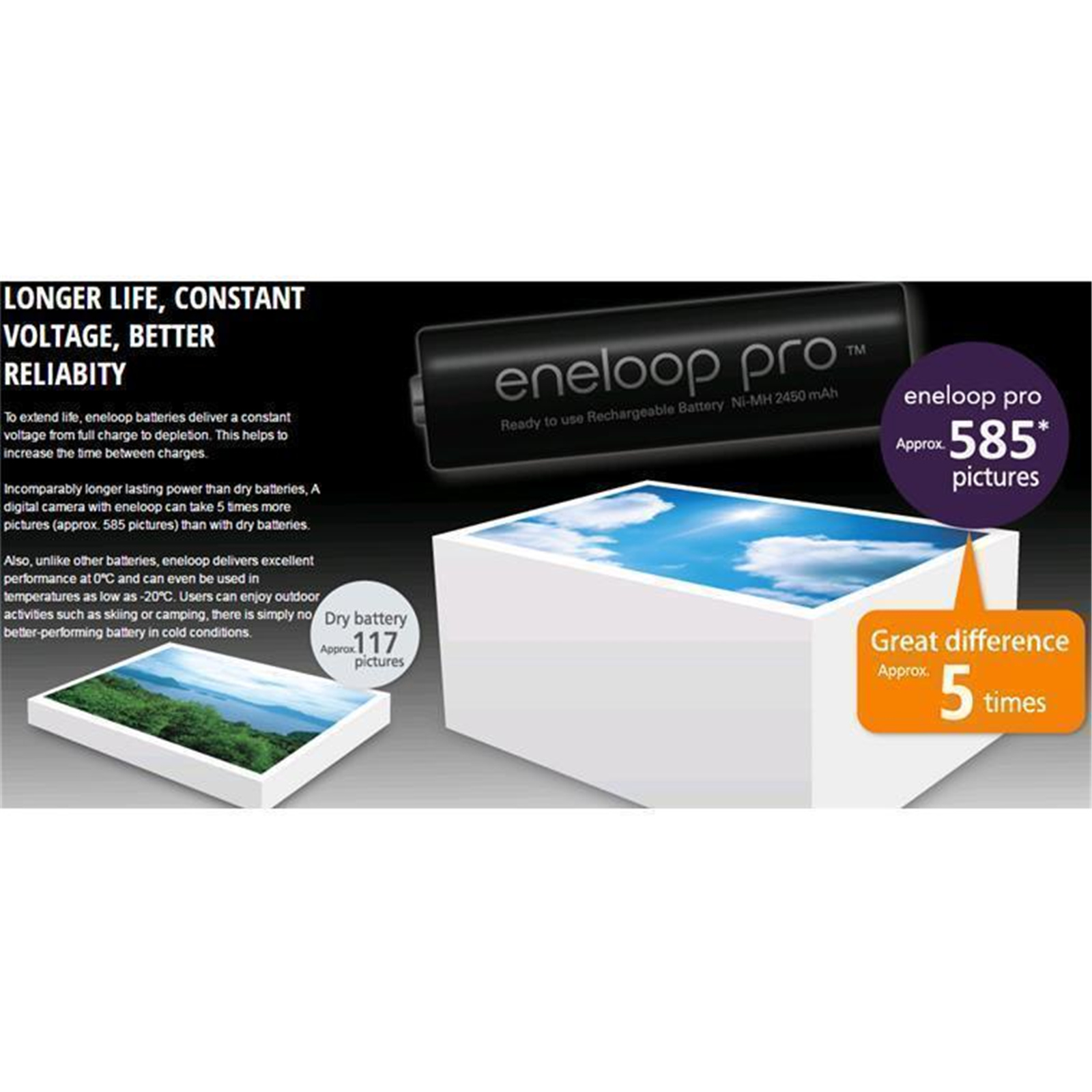 Incomparably longer lasting power than dry batteries, A digital camera with eneloop can take 5 times more pictures (approx. 585 pictures) than with dry batteries.