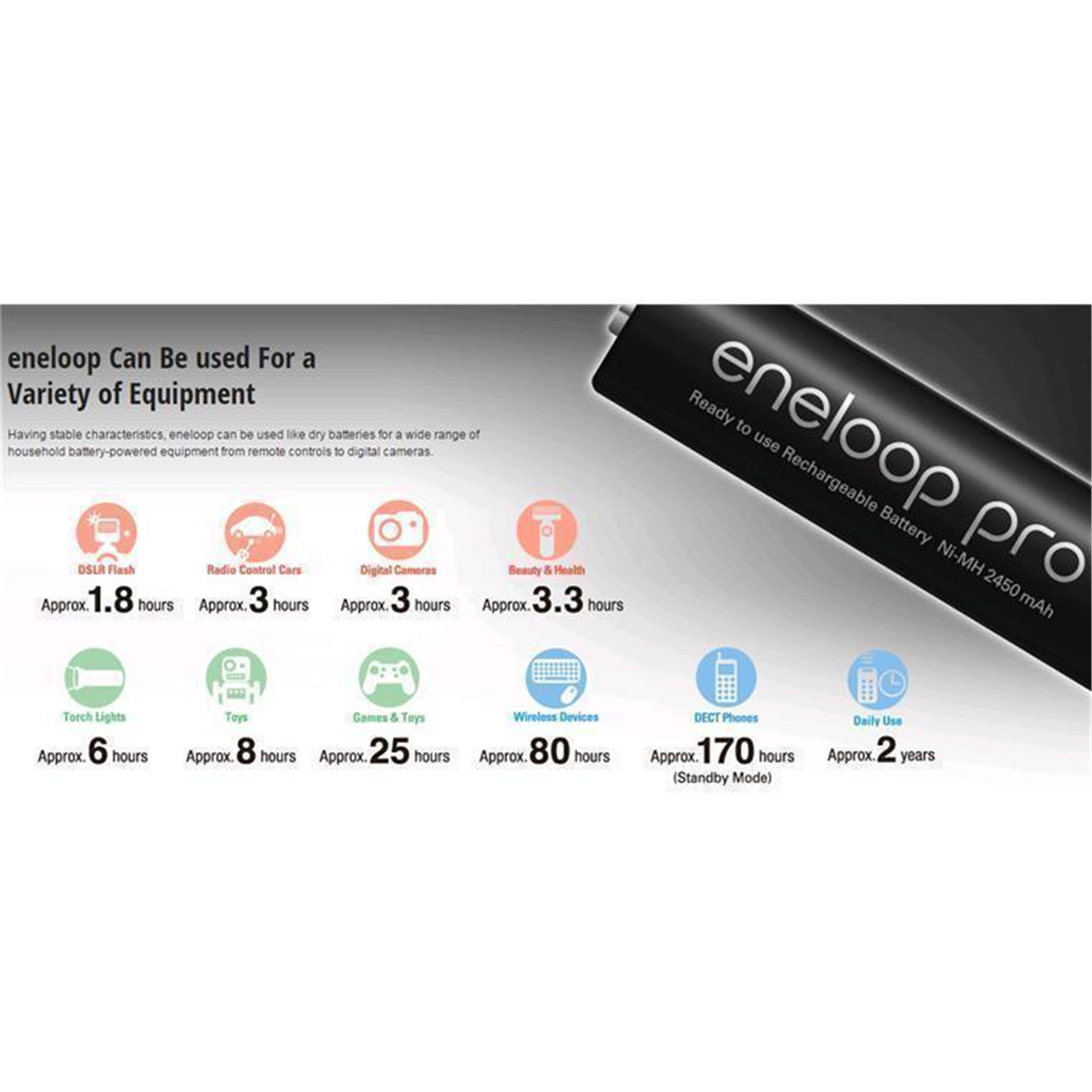 Having stable characteristics, eneloop can be used like dry batteries for a wide range of household battery-powered equipment from remote controls to digital cameras.