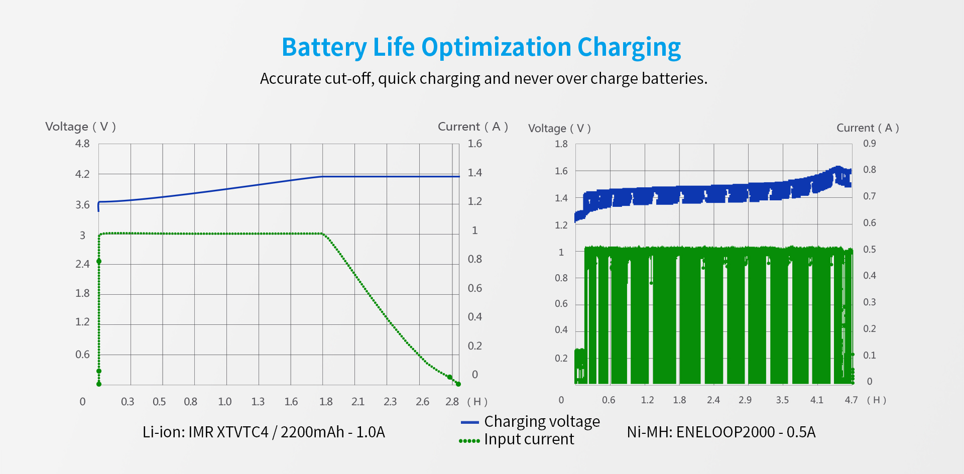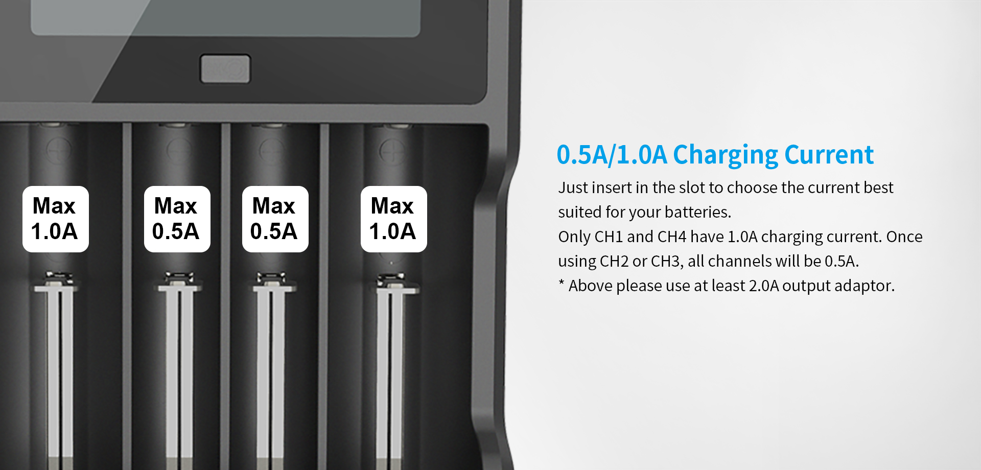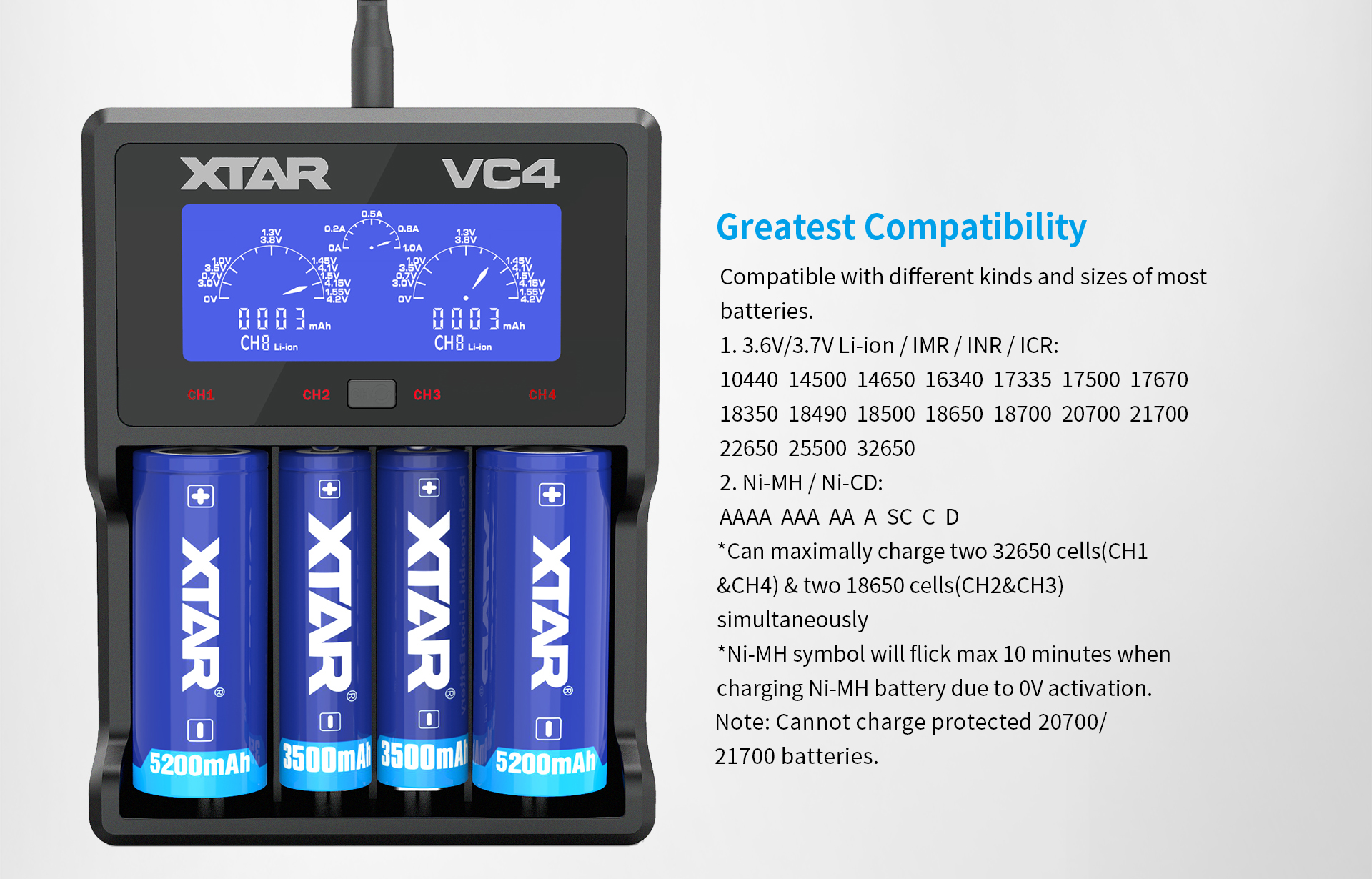 - Wide adaptability, adapts from 10440 to 32650, from Li-ion to Ni-MH