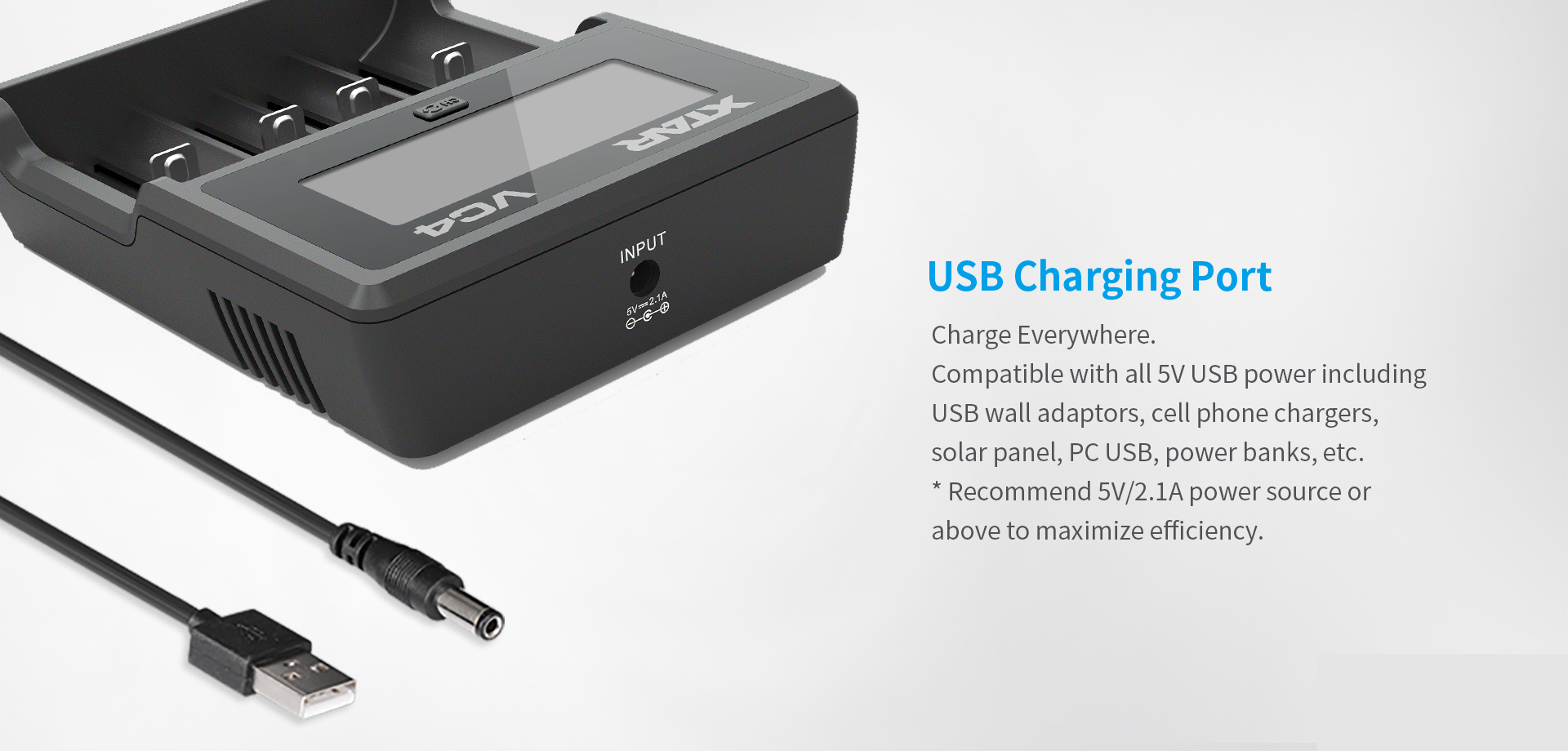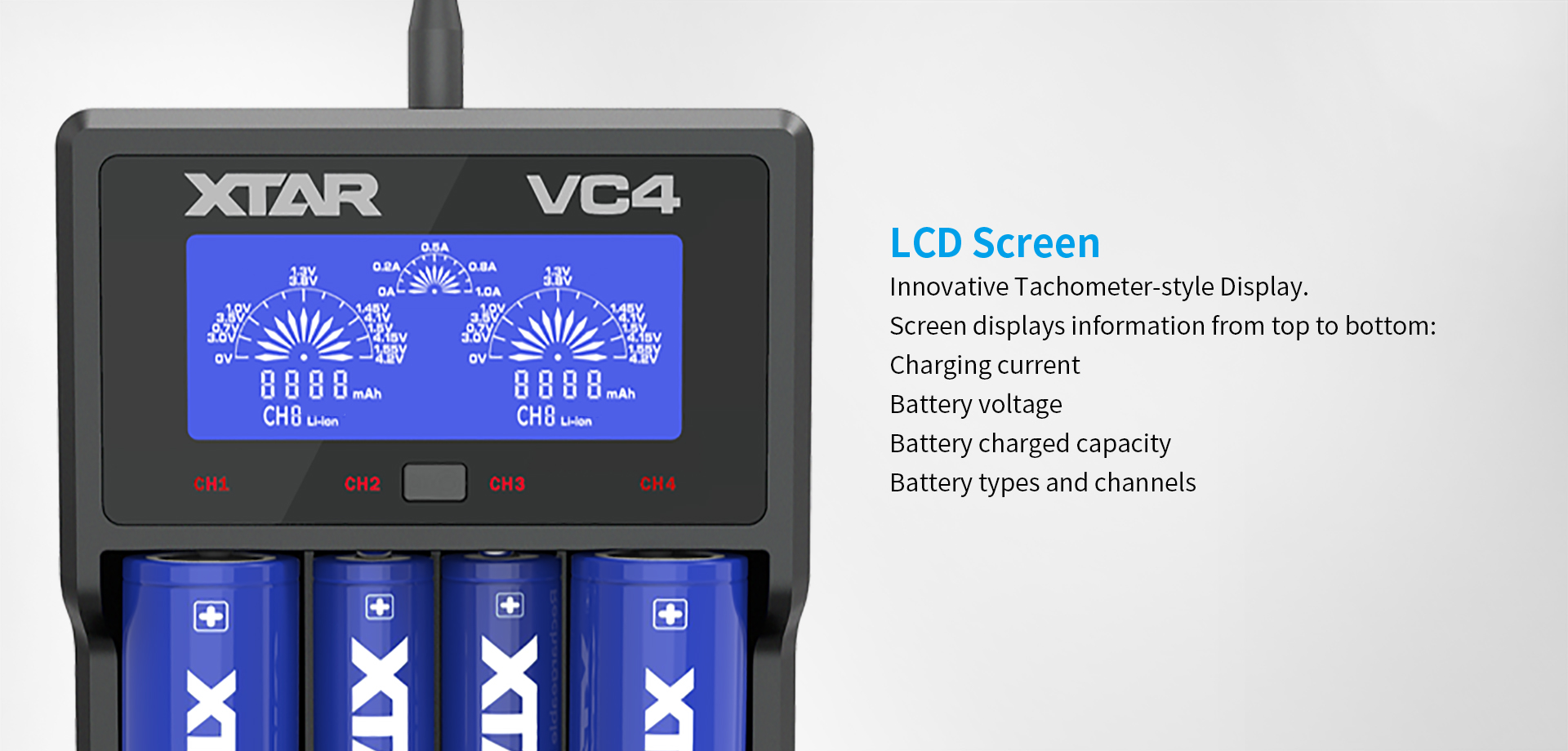 XTAR VC4 Smart Battery Charger LCD Display, USB Powered Li-ion and NiMH Compatible