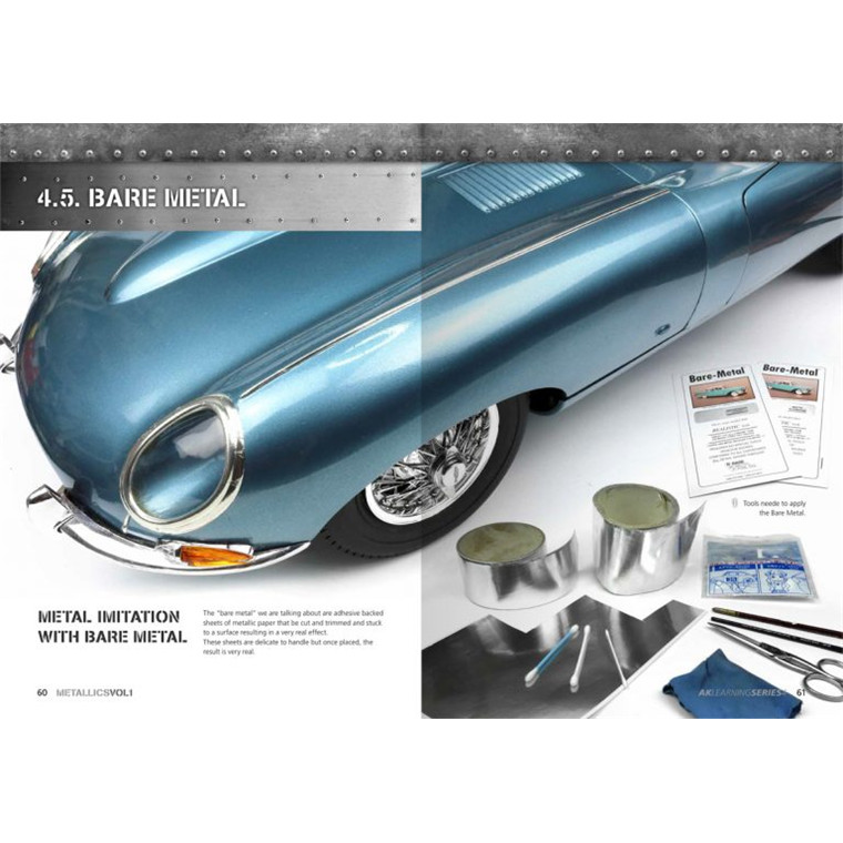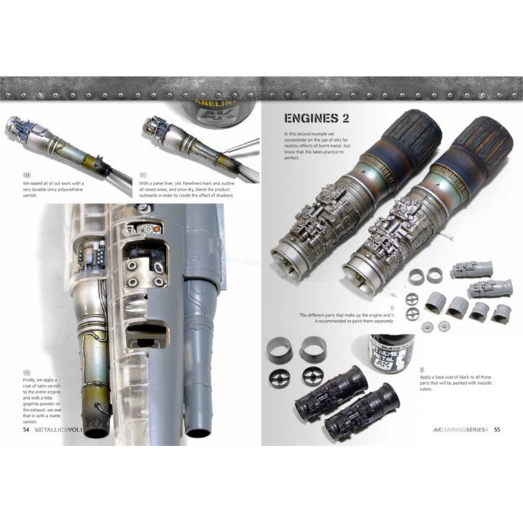 Metallics have always been a difficult task for modelers. It doesn't matter which modelling branch you choose, at some point you will find yourself in front of a metal piece/part which, of course, you want to finish as realistic as possible. There exist many ways to achieve a metal finish, from the use of enamels, towards waxes and bare metal sheets. Inside these two volumes dedicated to metallics, the talented artists from the AK Interactive Learning Series take you on a journey through the difficult tasks of mastering metallics. In this first volume we will show you how to understand metallic paints and how to apply them properly with the right products over vehicles. Also we cover techniques and share tips which come in handy when you are stuck. We will see examples applied on aircrafts, engines, Sci-fi vehicles, afv's and details on all kinds of models.