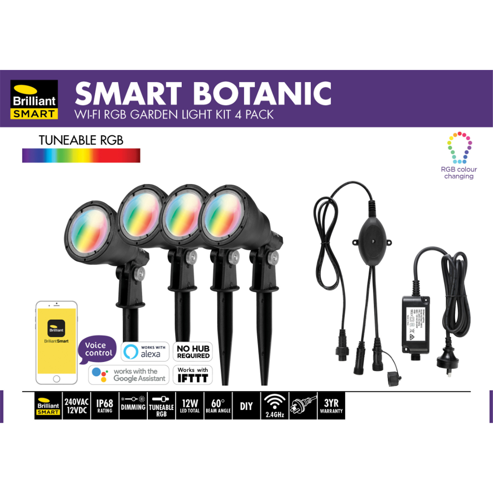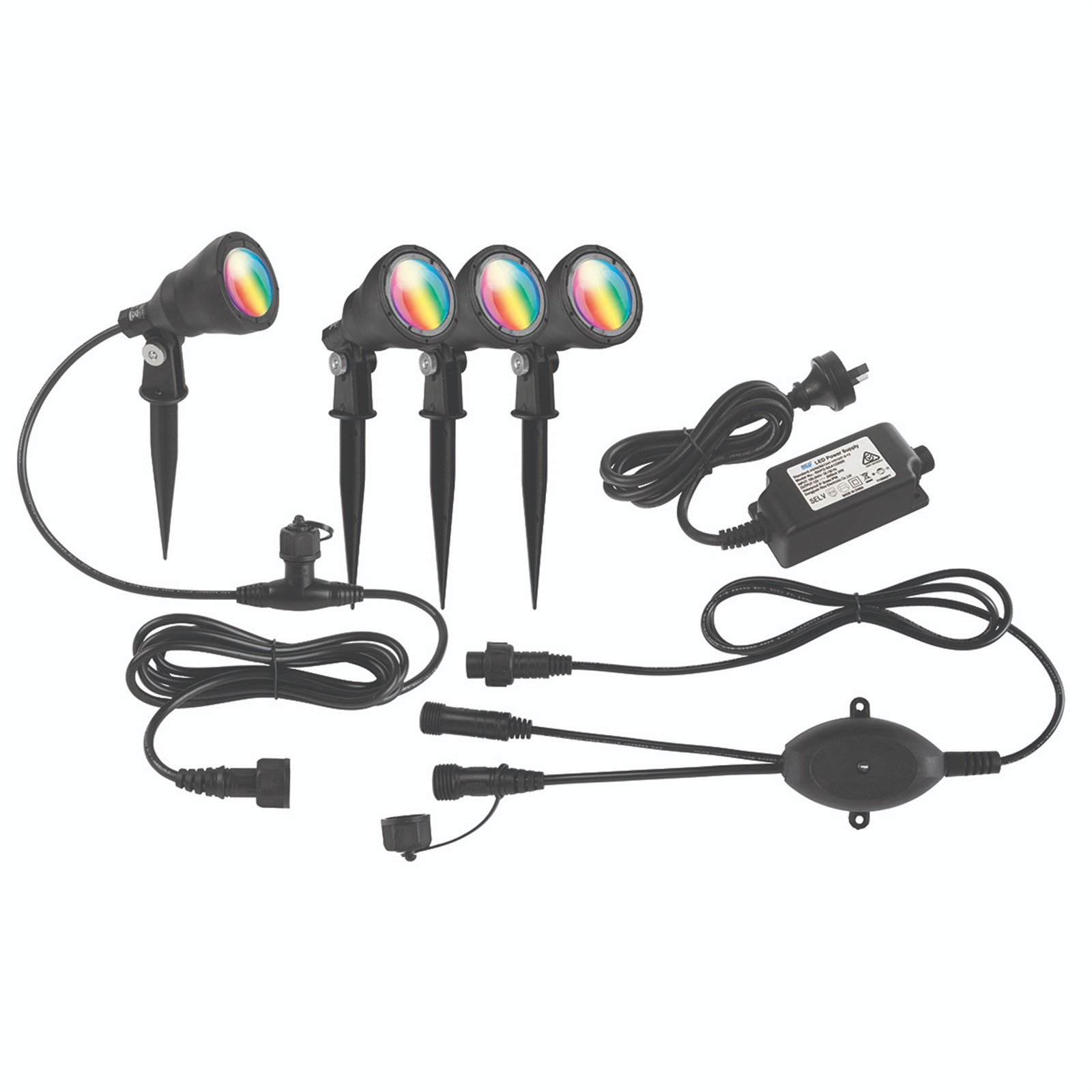 Brilliant Smart Wi-Fi RGB+White Garden Light Kit Smart App Control, 4 x LED spotlight, each with 2.2m cable, 160mm plastic stake, 3W per head RGB, IP68, Remote Control Enabled