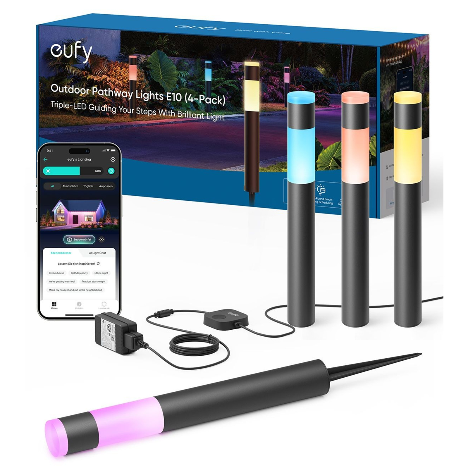 Enhance your yard and patio with the eufy Outdoor Pathway Lights E10, a 4-pack of smartwired RGBWW LED landscape lights that are IP65 waterproof, works with Alexa, offer appcontrol with endless AI light themes forfestivals and the ability to link with eufy cameras.