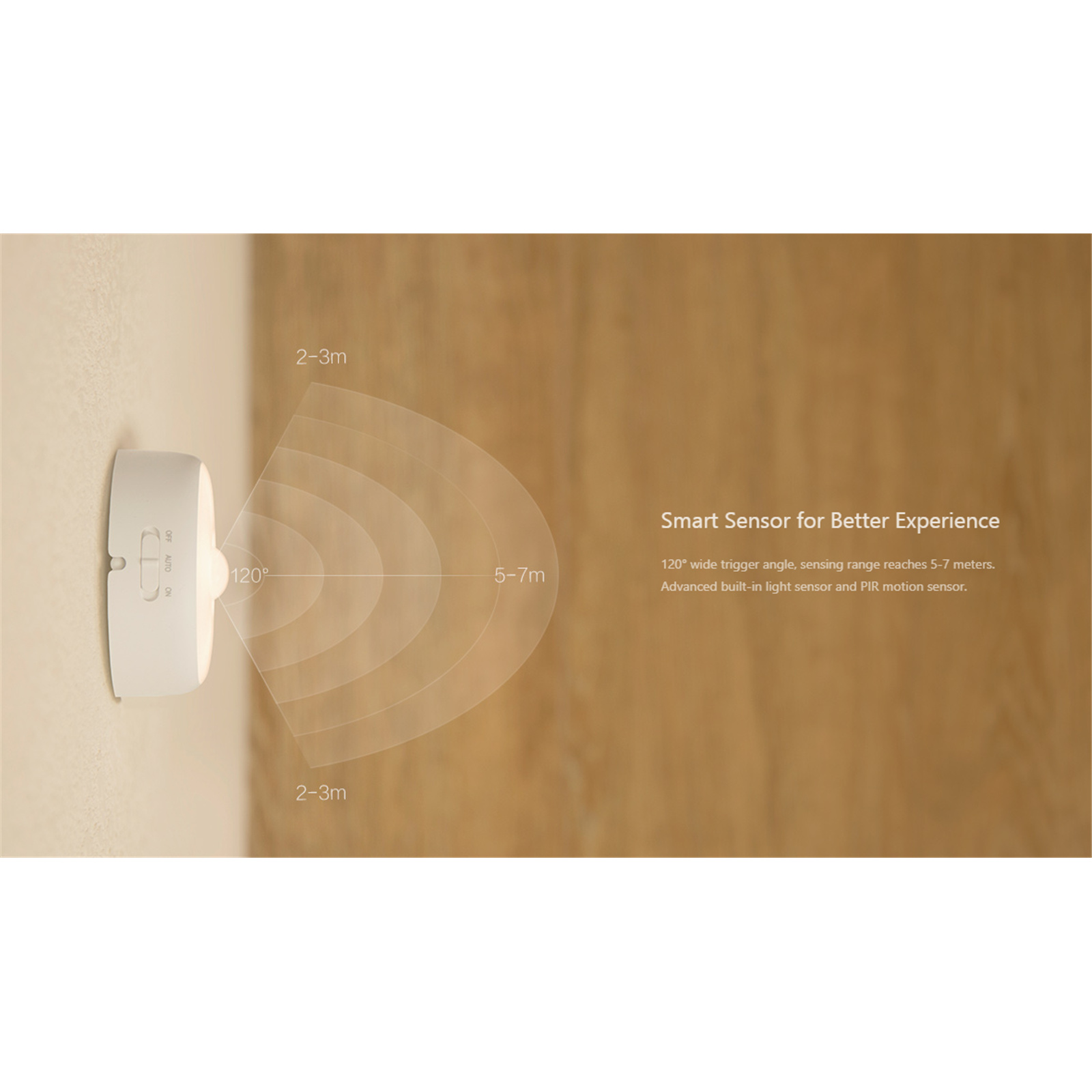 120° wide trigger angle, sensing range reaches 5-7 meters. Advanced built-in light sensor and PIR motion sensor.