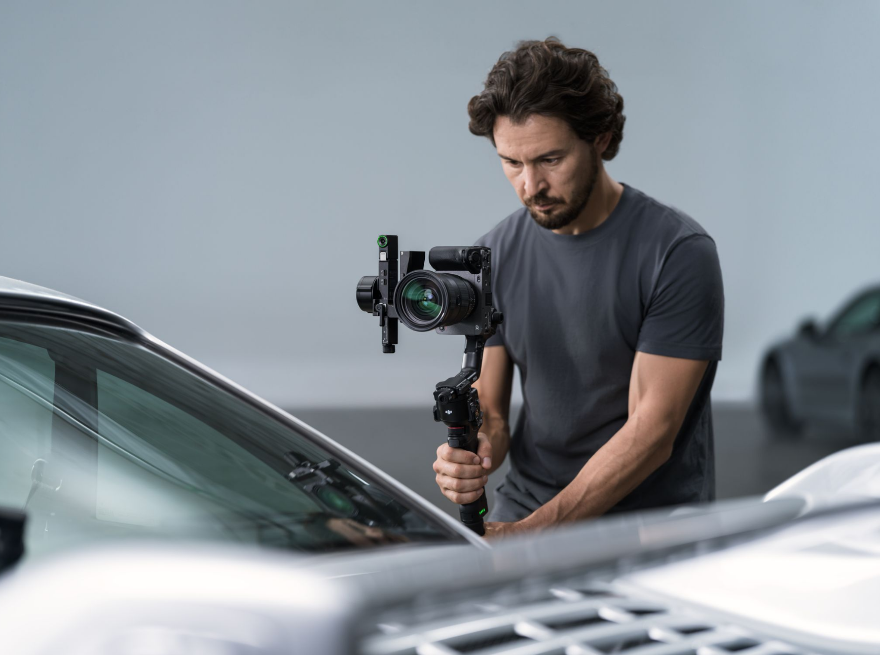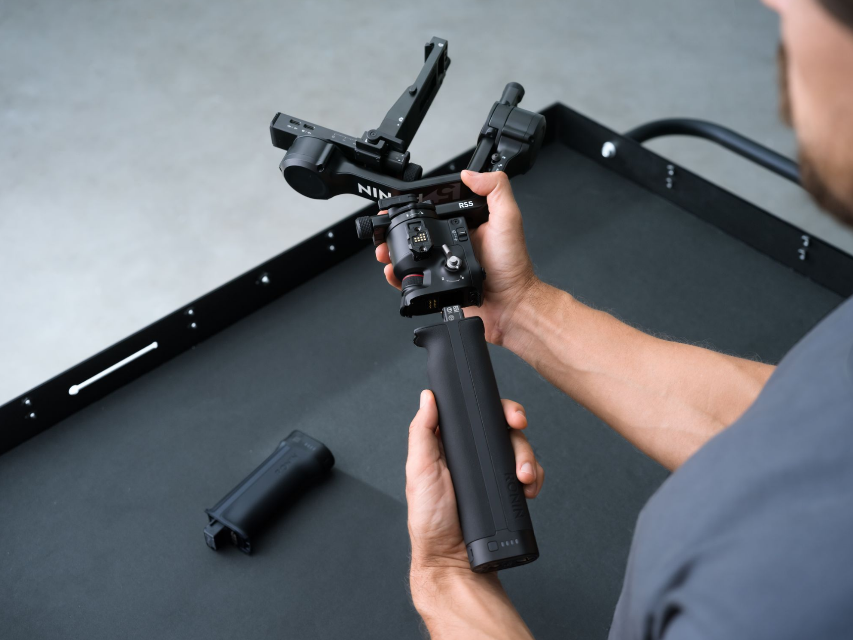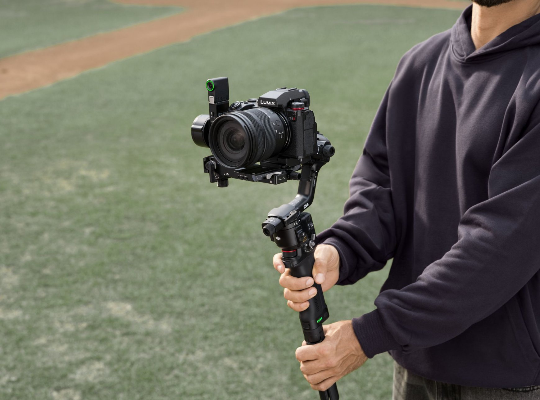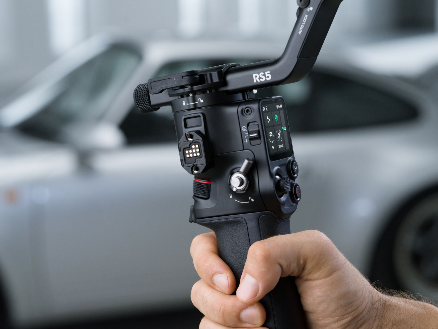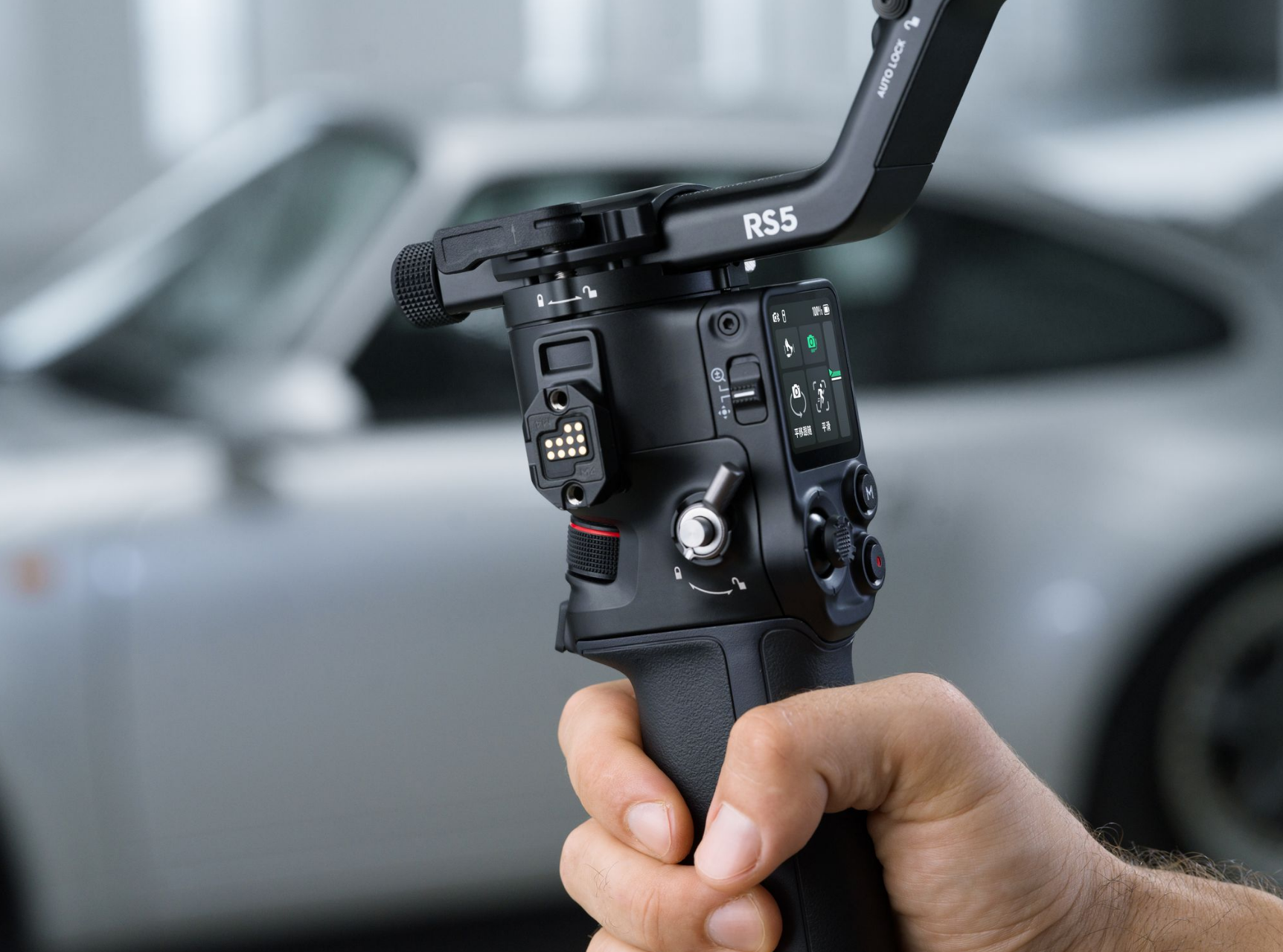 DJI RS 5 features touchscreen subject selection with the new tracking module [1], smooth balancing from fine-tuning knobs, and direct control via the new briefcase handle [2]-all backed by faster charging and extended battery life [3].