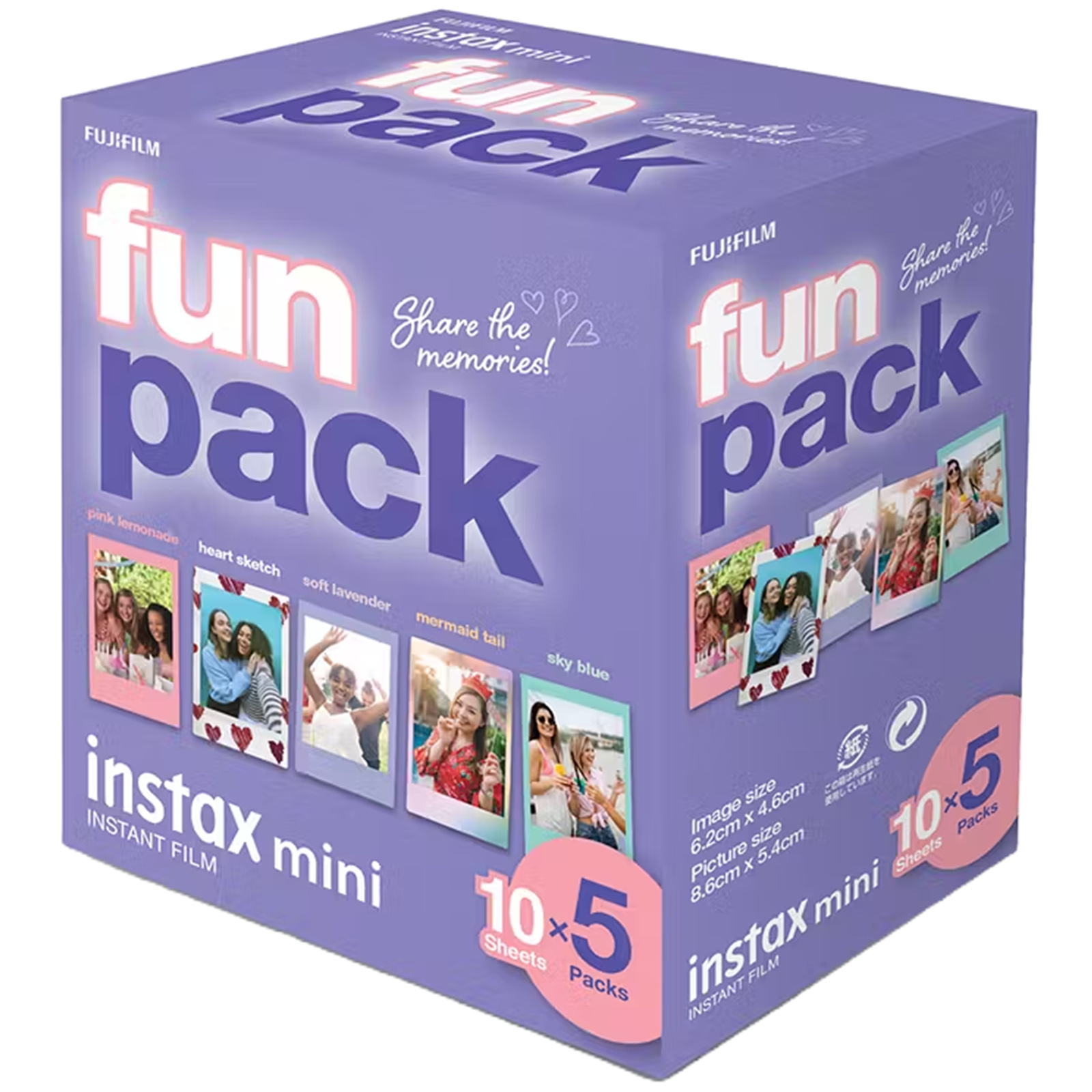 Infuse your photo prints with a charming touch using the Instax Mini Film Fun Pack! Perfect for your instant camera, this pack comes with a total of 50 film sheets that you can use for a variety of special occasions. It also comes in five unique designs, including Pink Lemonade, Heart Sketch, Soft Lavender, Mermaid Tail, and Sky Blue. Plus, it flaunts a compact 8.6cm x 5.4cm size, so you can easily bring it anywhere and share it with your loved ones.