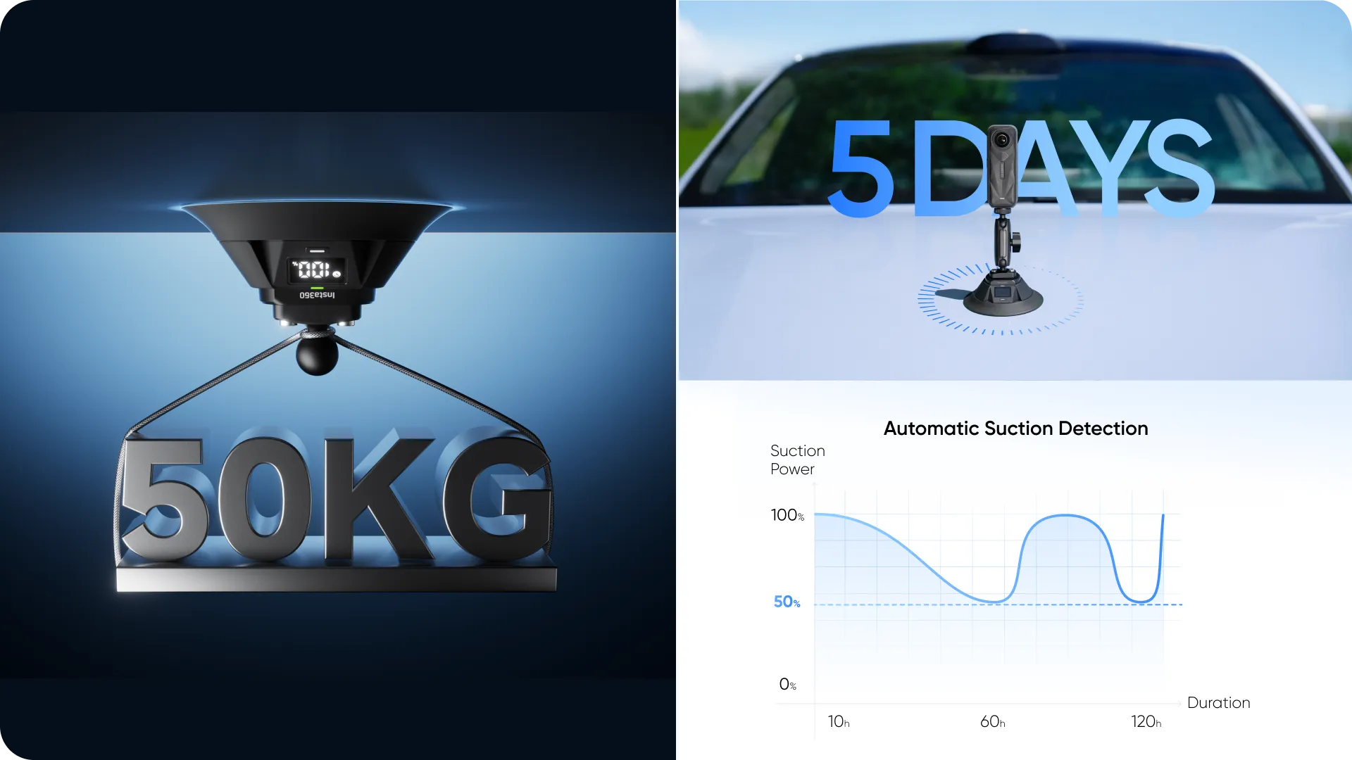 Upgraded design that locks instantly with one press. Built-in sensors continuously monitor suction so your rig maintains maximum grip at all times. Long-lasting battery offers up to 120 hours* of power with up to 5 days of suction on a full charge-ideal for road trips.
