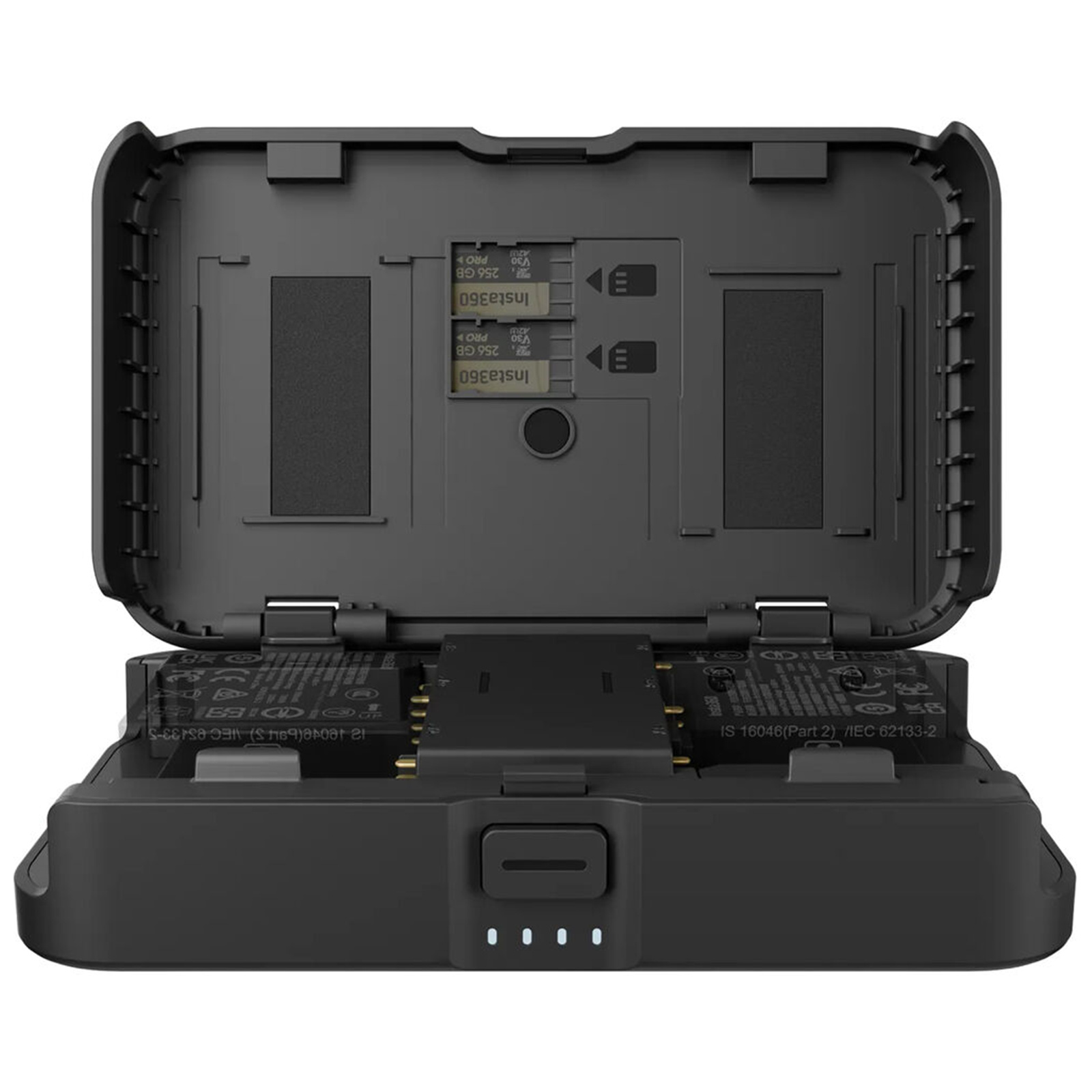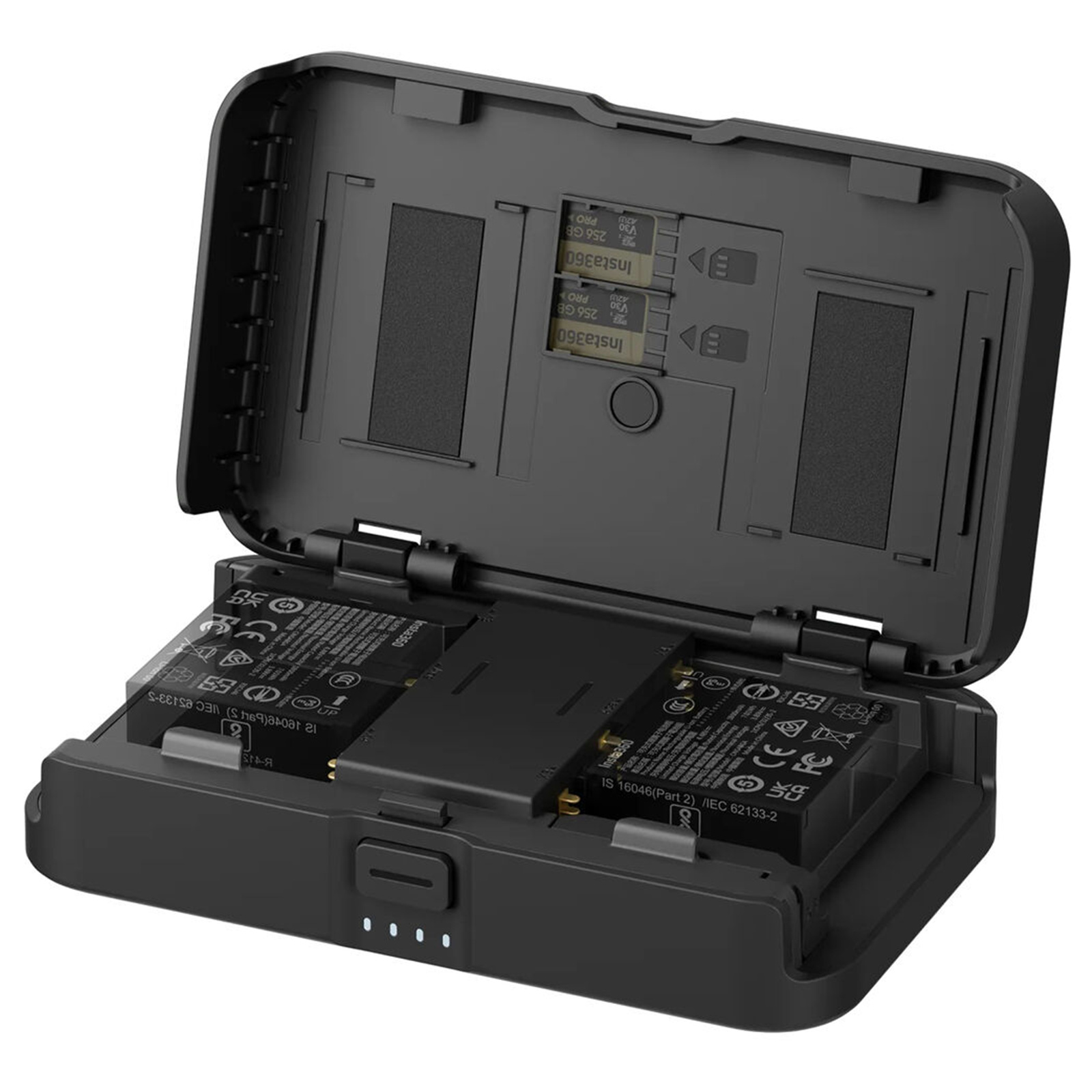 - On-the-go charging for two camera batteries, plus space for two microSD cards.