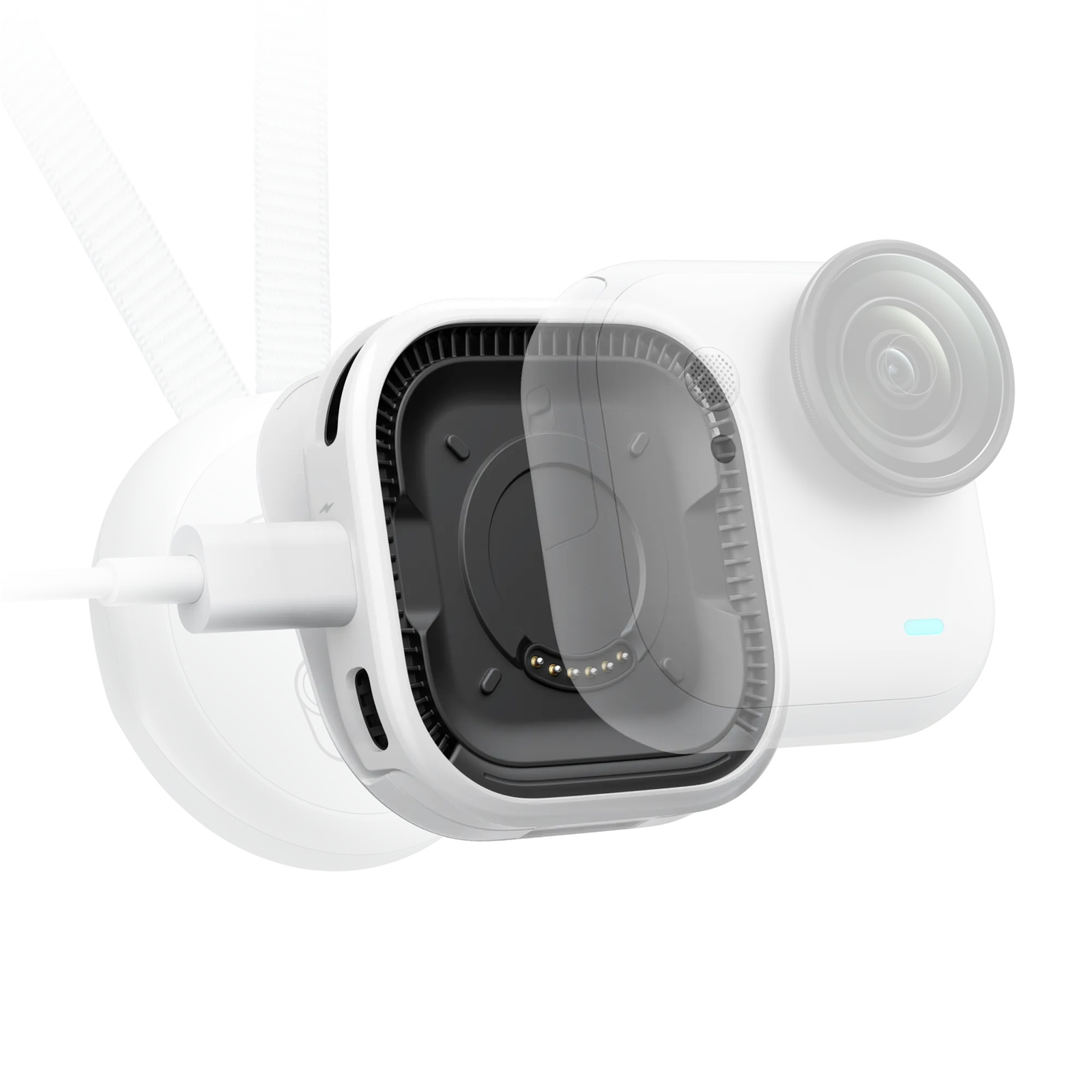 Magnetic pogo-pin base locks your standalone cam in place, with a USB-C port to connect a charger or power bank for an ultra-long run time.
