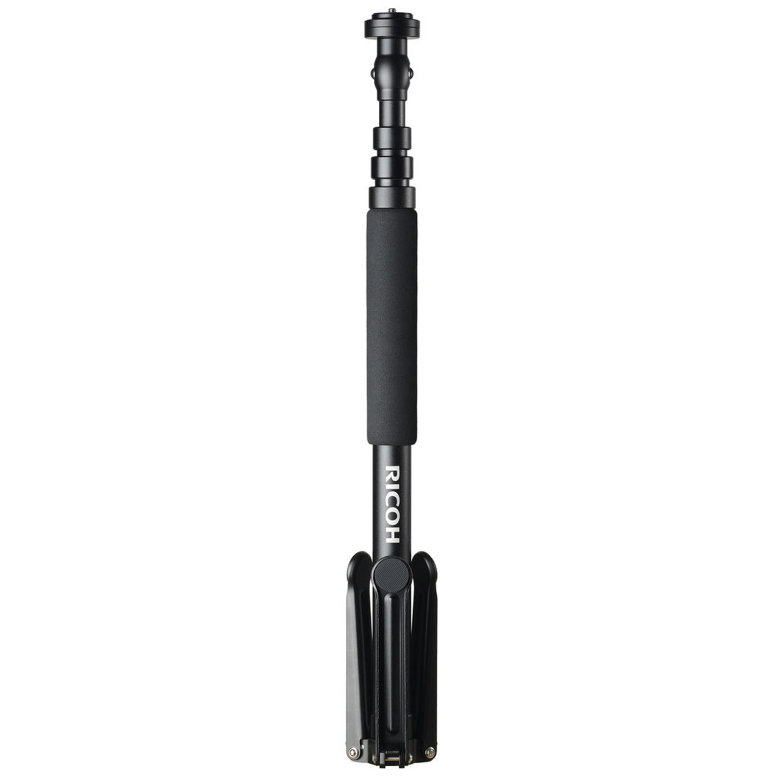 A monopod stand specially for the RICOH THETA series. The camera platform and leg are reduced in size to prevent them from appearing in a RICOH THETA's image, and a quick-release system is adopted for the camera platform. The length when stowed is about 56 cm, and it can be extended up to 152 cm with a single touch of a button.