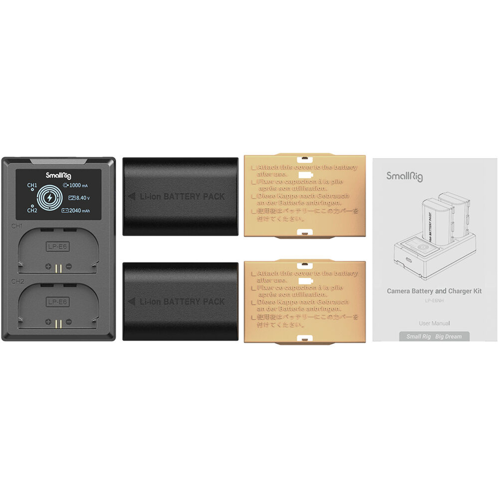 SmallRig LP-E6NH Camera Battery and Charger Kit 3821 includes two batteries and one charger. The battery, equipped with a full decoding chip, supports varied cameras perfectly without causing pop-up windows and has quality fireproof ABS and PC shell frosted to ensure fine touch and durability. It is the same size as the original battery, thus fitting seamlessly into battery compartment. The dual battery charger can charge two batteries at the same time, with its LCD screen displaying real-time charging voltage, current and charged capacity. It comes with built-in USB-A charging cable and USB-C input interface, allowing it to be charged via USB adapter, car charger, power bank.