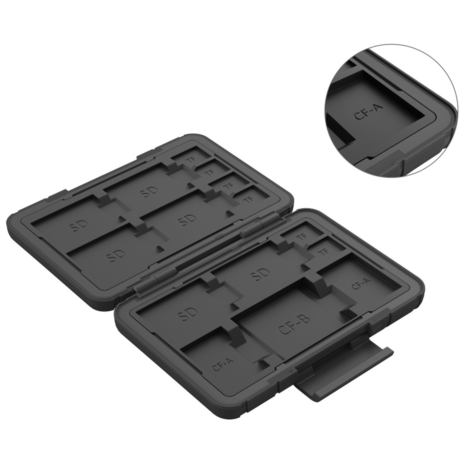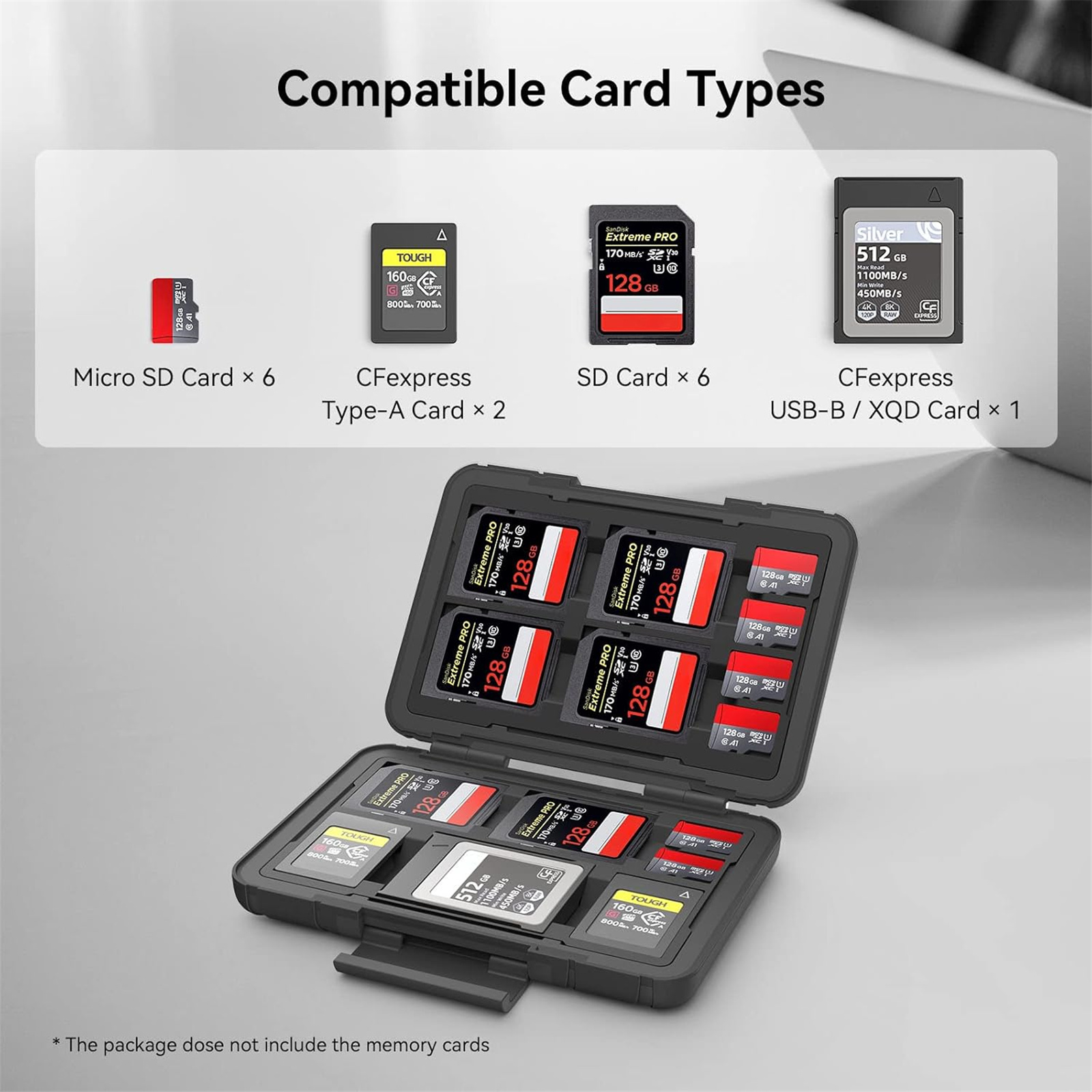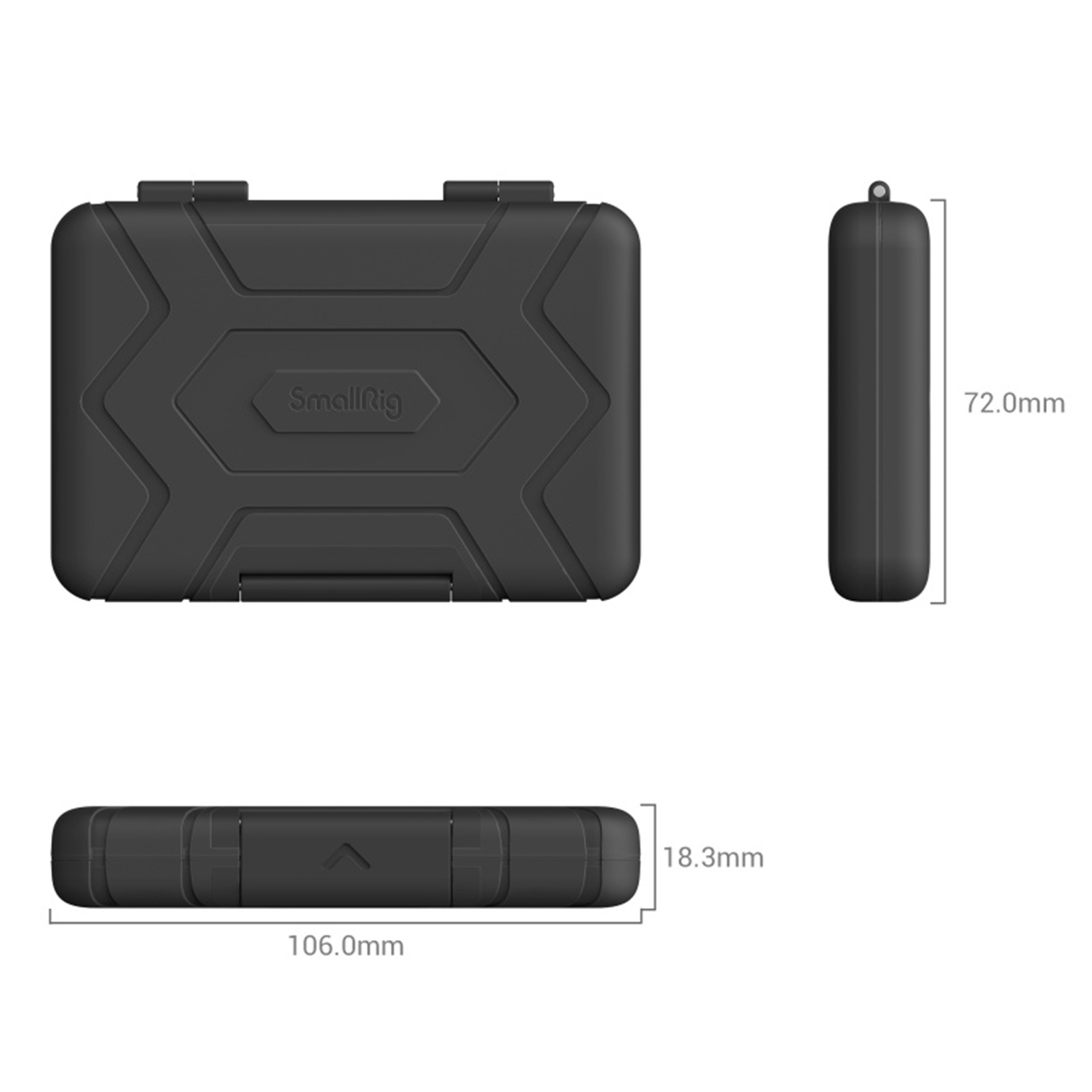 SmallRig Memory Card Case 3192 is designed for storage and protection of memory cards. It looks pretty and feels comfortable with uneven, anti-slip texture and can accommodate 6 SD cards, 6 Micro SD cards, 2 CFexpress Type A cards, 1 CFexpress Type B card (or XQD card) at the same time. The case comes with an easy-to-operate on/off fastener, sealable silicone linings that prevent splashing and dust, card holders with printed name of compatible cards for identification, and anti-shock card trays wrapping and fixing cards. Having passed a 2m drop test, this item can effectively protect your memory cards from accidental falls.