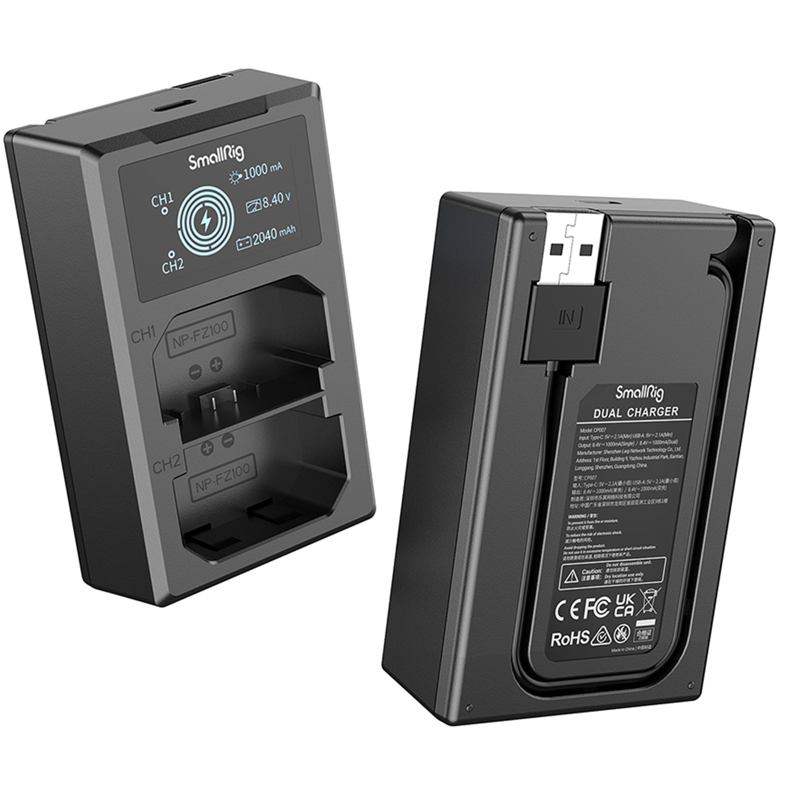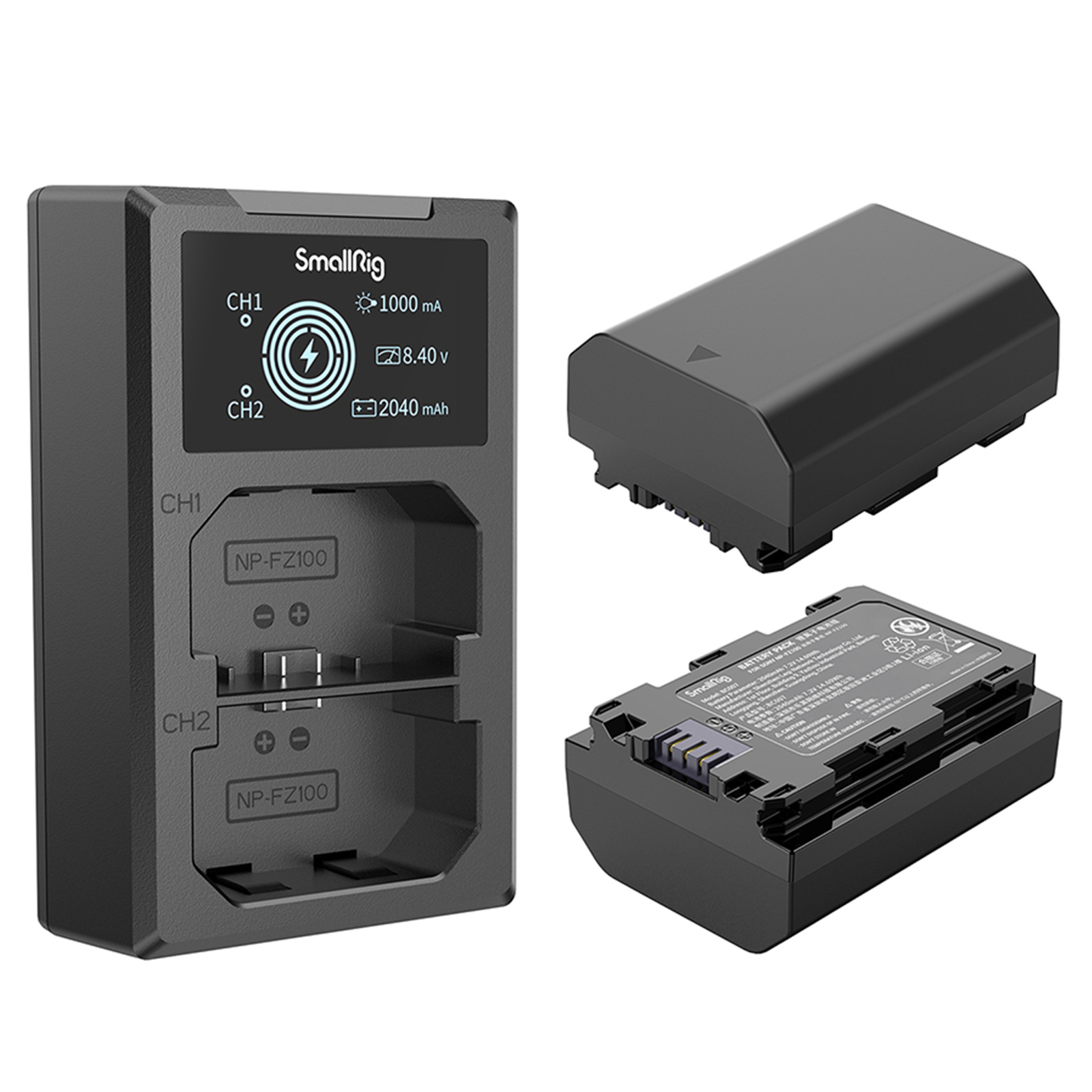 SmallRig NP-FZ100 Camera Battery and Charger Kit 3824B includes two batteries and one charger. The battery, equipped with a full decoding chip, supports varied cameras perfectly without causing pop-up windows and has quality fireproof ABS and PC shell frosted to ensure fine touch and durability. It is the same size as the original battery, thus fitting seamlessly into battery compartment. The dual battery charger can charge two batteries at the same time, with its LCD screen displaying real-time charging voltage, current and charged capacity.It comes with built-in USB-A charging cable and USB-C input interface, allowing it to be charged via USB adapter, car charger, power bank.