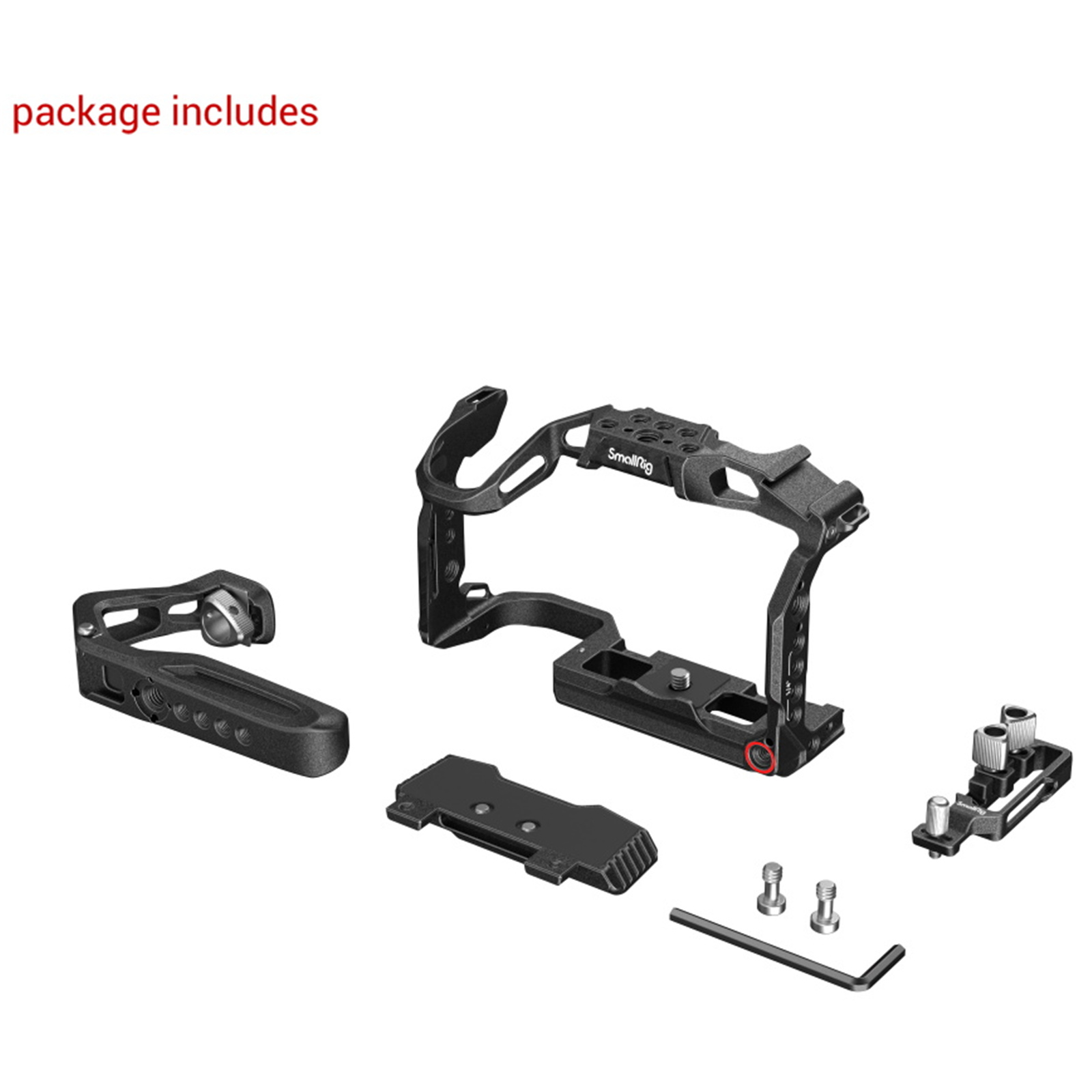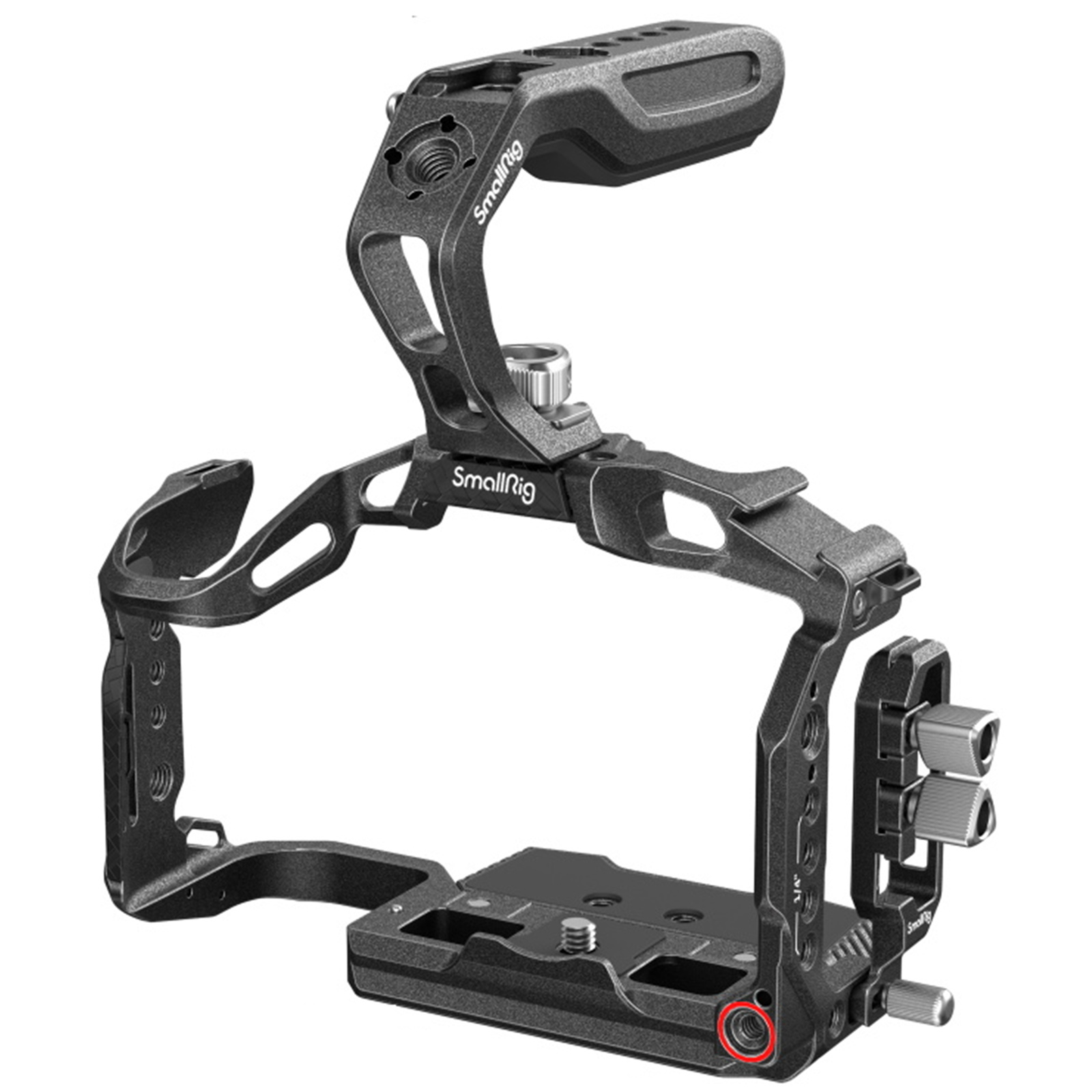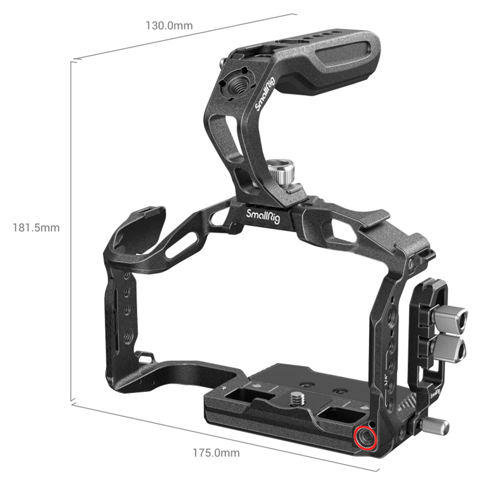 SmallRig "Black Mamba" Handheld Kit for Canon EOS R5 C 3891 is designed to protect camera, provide comfortable low-angle shooting experience and accessory mounts. It includes an ARRI top handle, a full cage and a dedicated cable clamp. The ergonomically-designed top handle feels comfortable and facilitates low-angle shot and camera movement; the "Black Mamba"-style cage, which fits EOS R5 C elements, gives full access to camera buttons and consists of a front cage and a detachable extended baseplate, combined to provide various shooting solutions. The kit comes with 1/4"-20 threaded holes, 3/8"-16 threaded holes, cold shoes, NATO rail for Side Handle 3260, Magic Arm 2070, Monitor Mount 2903, Battery Adapter Plate 3168, Portable Power Bank Holder 2336, microphone, LED light, etc; and a bottom Arca-Swiss plate, which supports RS 2 / RSC 2 / RS 3 / RS 3 Pro and Arca-Swiss tripod, enabling quick switch among handheld, stabilizer, and tripod shooting. Its thumb-screw HDMI & USB-C cable clamp can prevent accidental disconnection and ensure stable signal transmission. Also, the cage includes a dual-head Allen wrench for easy assembly and disassembly.