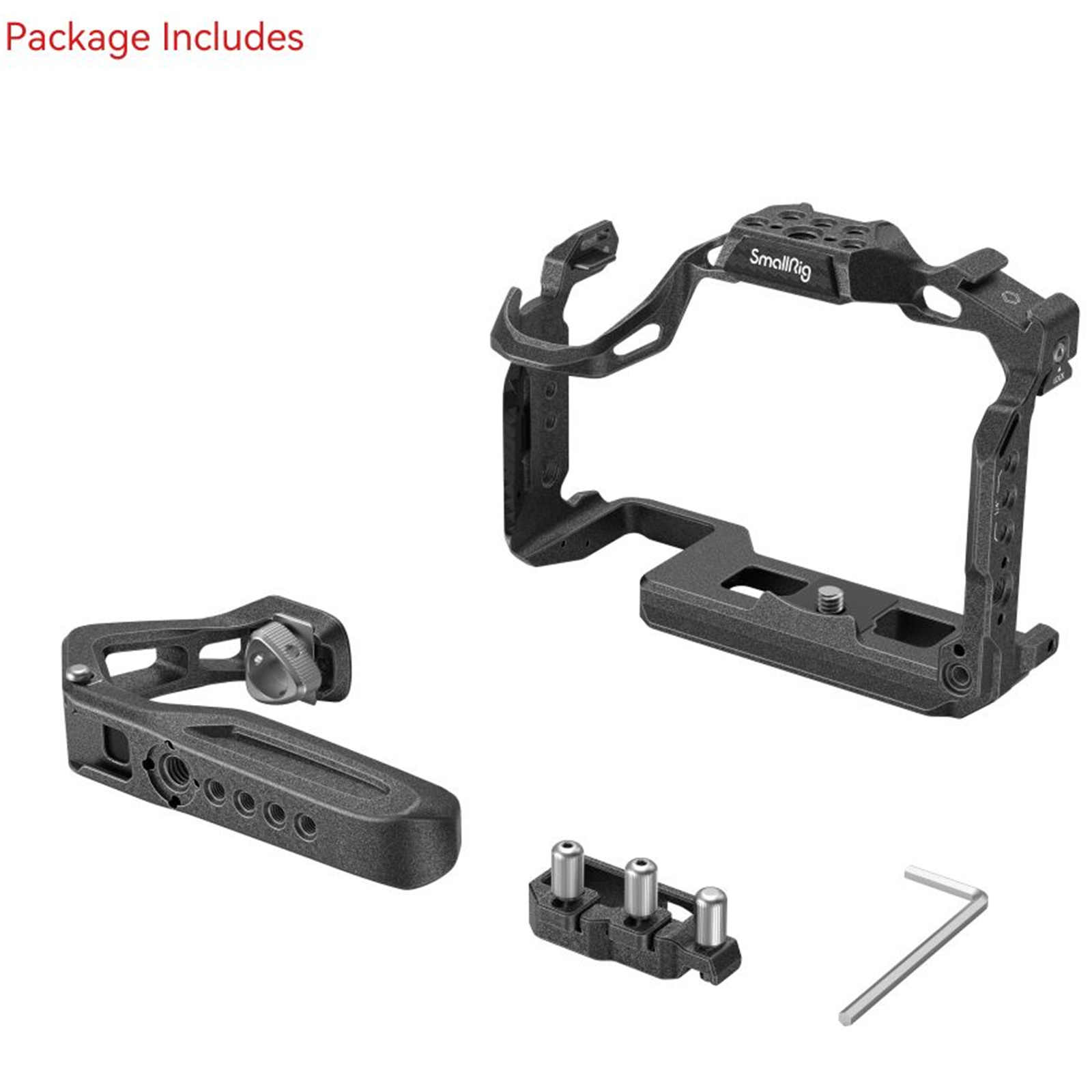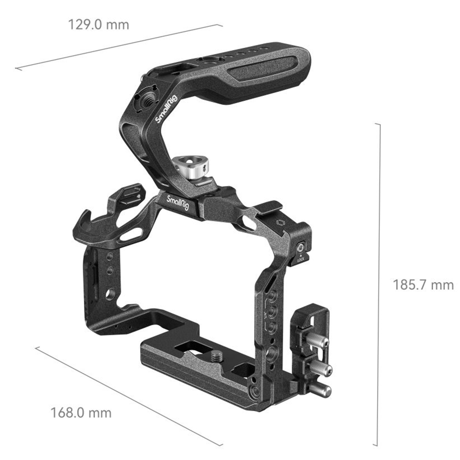SmallRig"Black Mamba" Cage Kit for Panasonic LUMIX G9 II / S5 II / S5 IIX 4024 is designed to assist with handheld shooting and attach accessories. It includes a cage, a HDMI & USB-C cable clamp and a top handle, in which, the ergonomic top handle feels comfortable, and facilitates camera movement and low-angle shot; the streamlined cage with clear edges gives full access to top controls; and the thumbscrew-tightened cable clamp can fix HDMI & USB-C cables at the same time. Among the accessory mounting points, 1/4"-20 threaded holes support Top Handle 3322, Holder for Portable Power Banks BUB2336; cold shoe mounts suit microphone, LED video light, etc.; and ARRI 3/8"-16 locating holes fit Monitor Mount 2903B. It also comes with a NATO rail on the left side for Side Handle 3847, and strap holes on both sides, which are compatible with "Black Mamba" Hand Strap 3848. Besides, a magnetic wrench is included for easy disassembly and assembly.