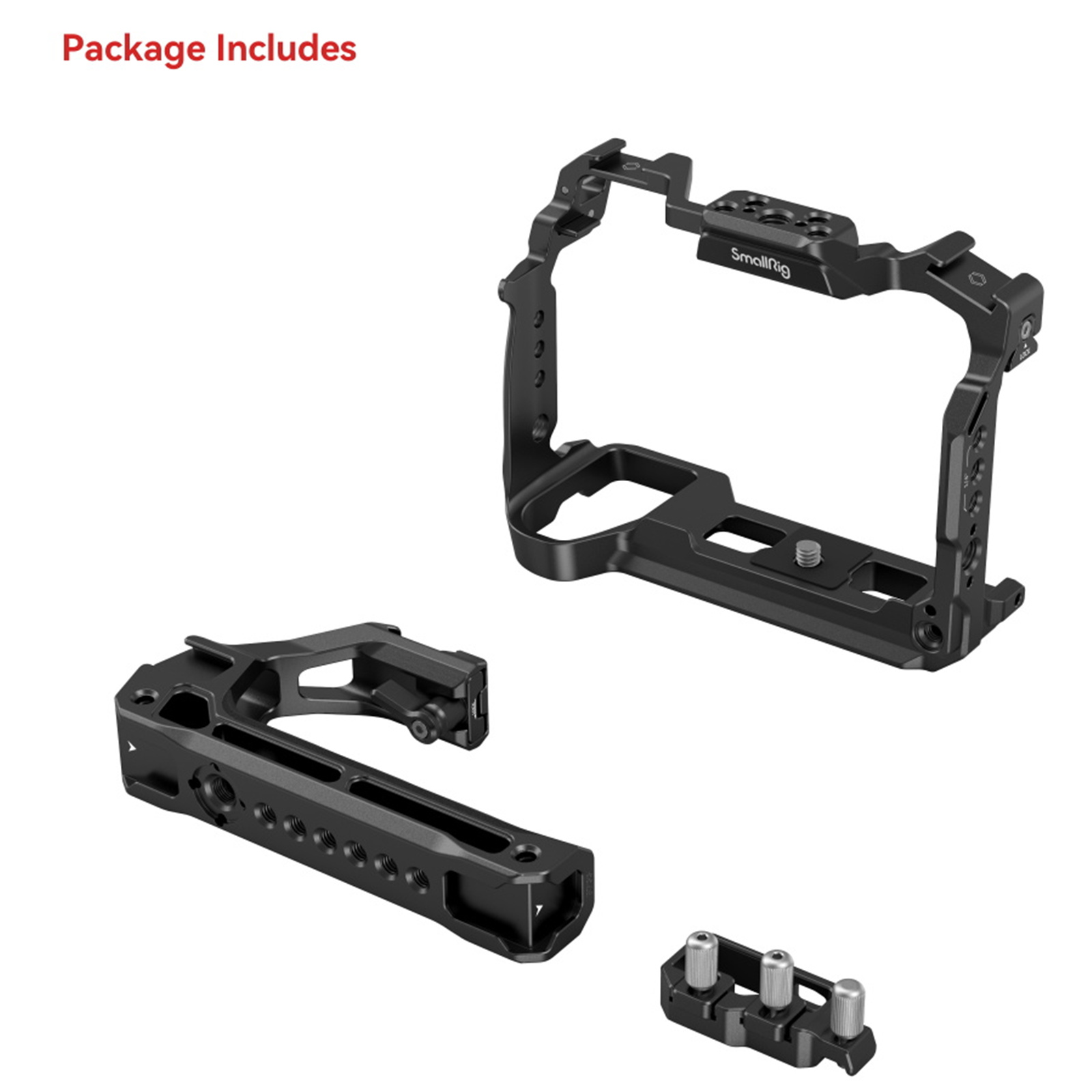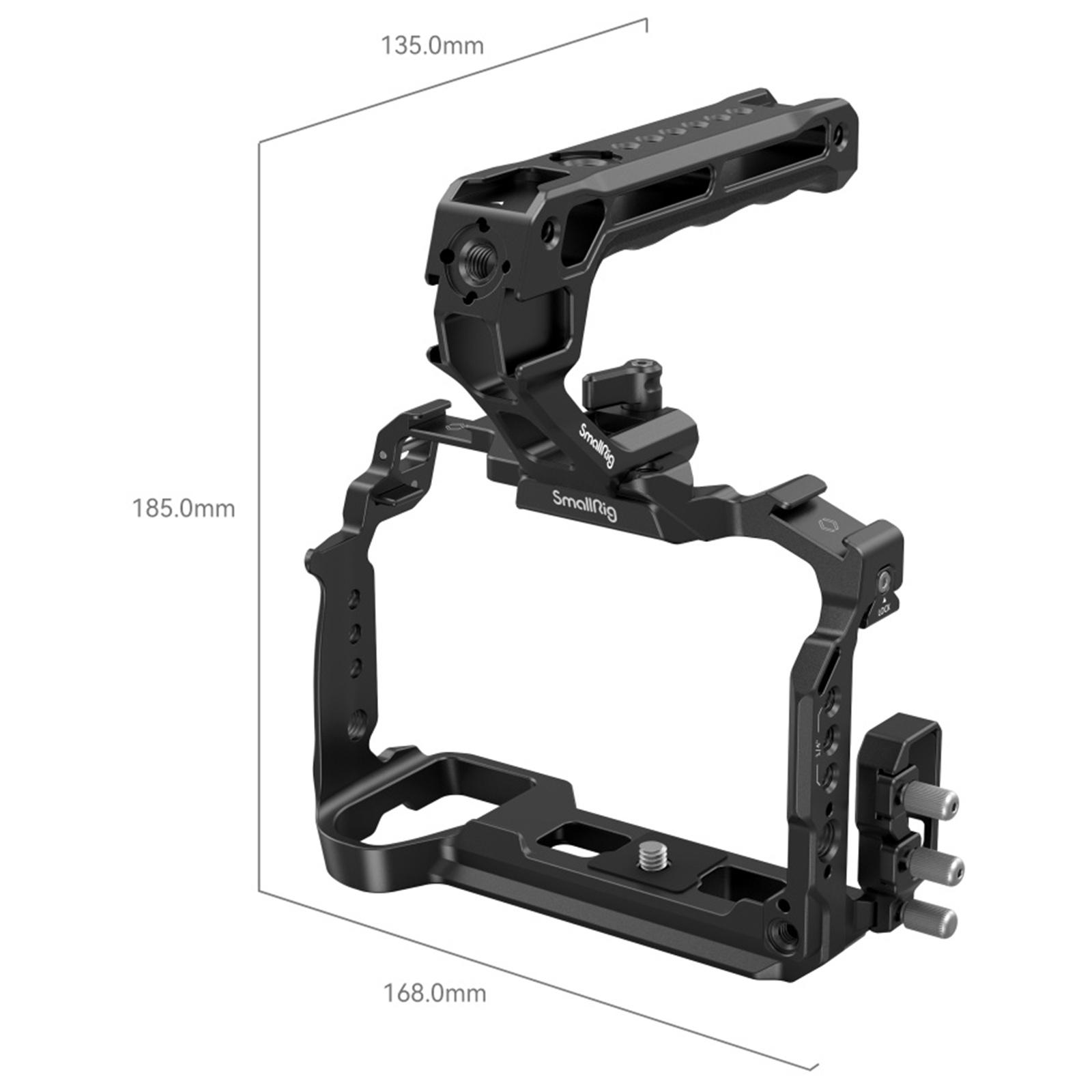 SmallRig Cage Kit for Panasonic LUMIX G9 II / S5 II / S5 IIX 4143 is designed to assist with handheld shooting and attach accessories. It includes a cage, a HDMI & USB-C cable clamp and a top handle, in which, the top handle, ergonomically designed to enhance grip, connects to the cage via NATO clamp and the thumbscrew-tightened cable clamp can fix HDMI & USB-C cables at the same time. Among the accessory mounting points, 1/4"-20 threaded holes support Side Handle 3322, Holder for Portable Power Banks BUB2336; cold shoe mounts suit microphone, LED video light, monitor, etc; and ARRI 3/8"-16 locating holes fit Monitor Mount 2903B. It also comes with a NATO rail on the left for Side Handle 3847 and strap holes on both sides, which are compatible with hand strap. Besides, a magnetic wrench is included for easy disassembly and assembly.