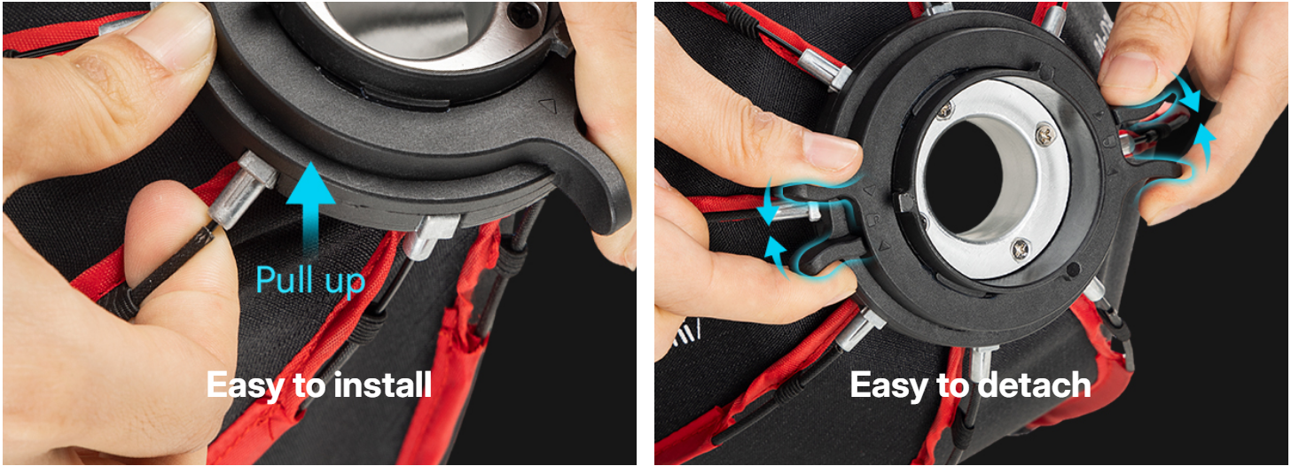 - Quick Release Design: With the new generation of self-developed quick-release patented designs, opening and folding a softbox is just one click away. Lift the opposite rods to set it up and click the quick release buttons to fold it back.