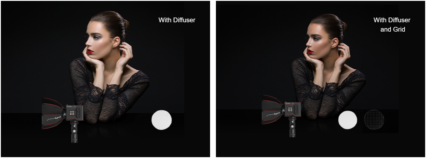 Using package included diffuser cloth x 1 and grid x 1 to freely combined in various situations