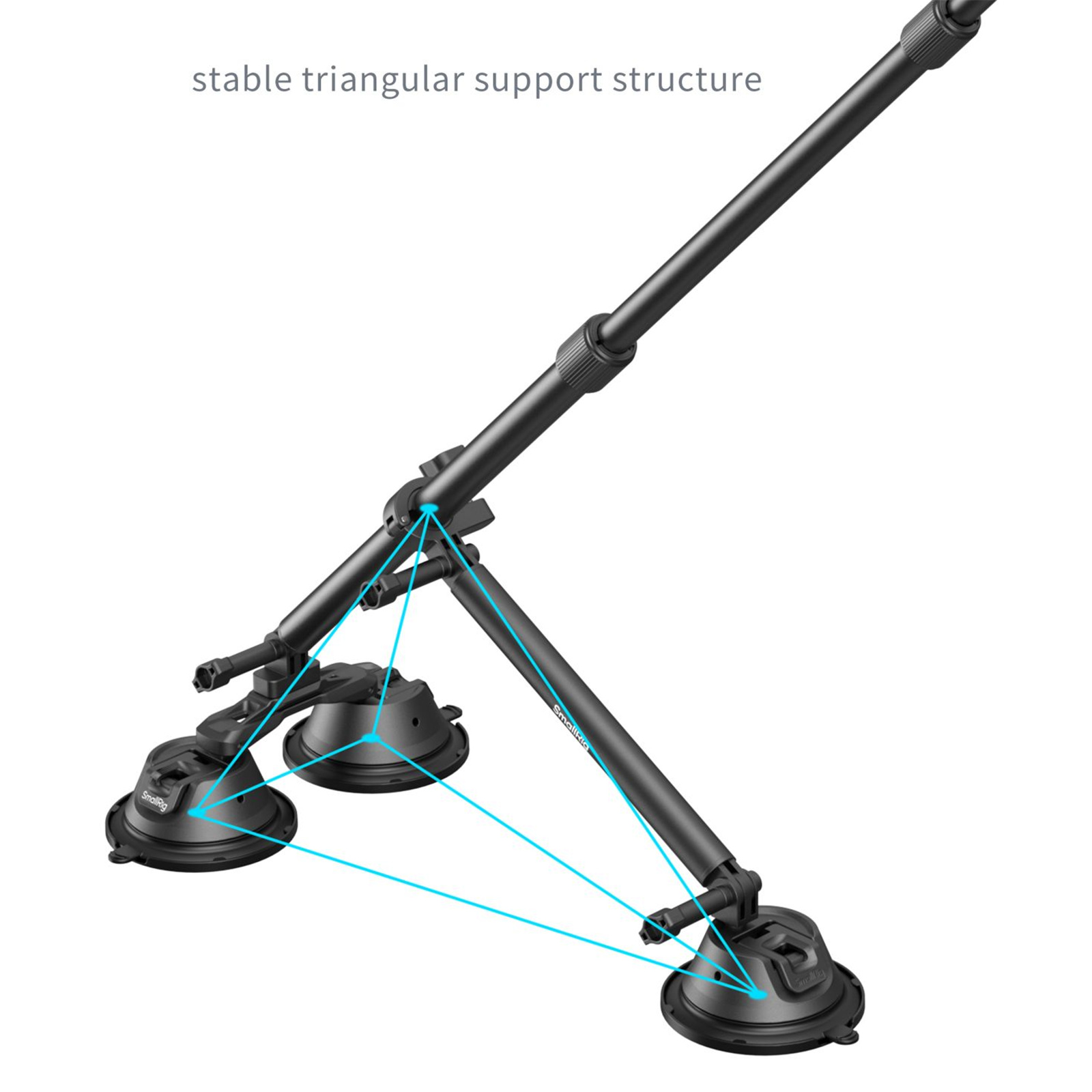 Fully enclosed rod clamp secures the telescopic rod, providing a reliable triangular support structure.