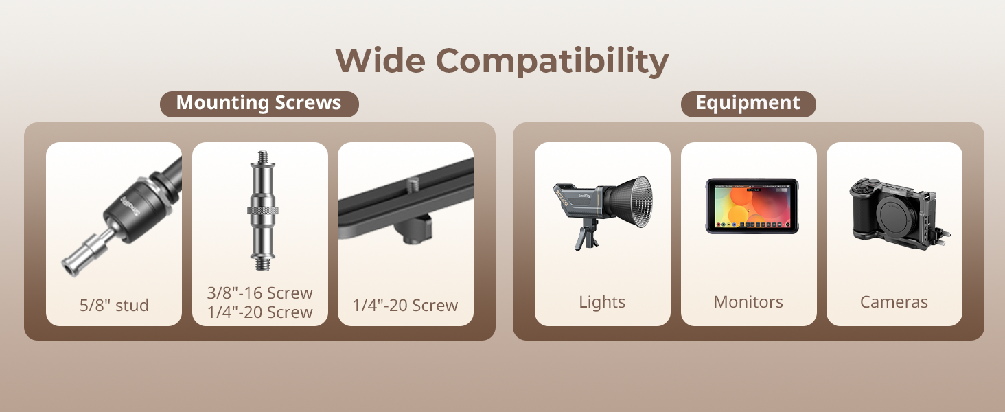 Works with 1/4"-20 & 3/8"-16 double-ended studs, 1/4"-20 and M5 threaded holes, ideal for cameras, monitors, lights and other filmmaking equipment;