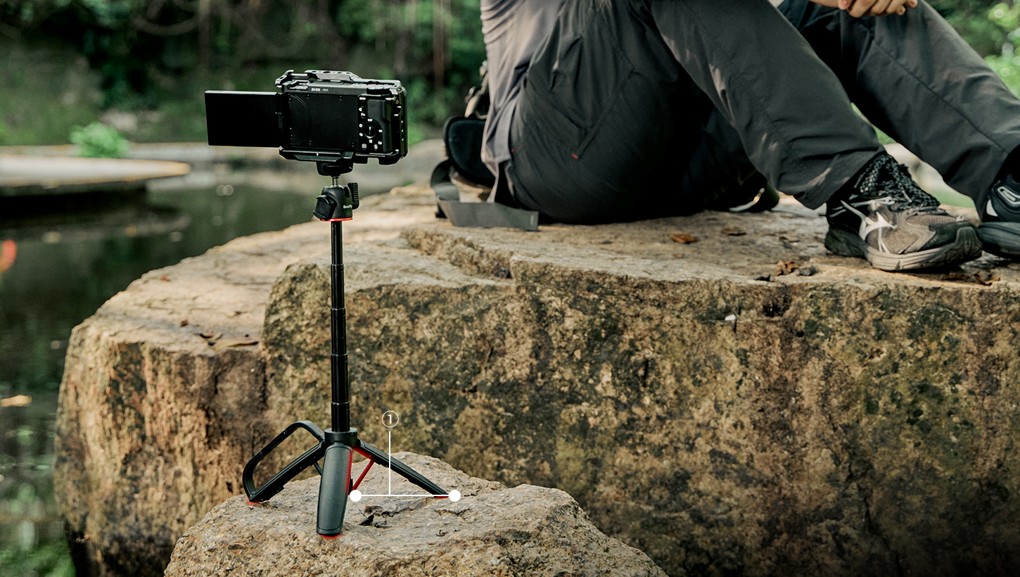 ①Silicone foot pads and stabilizing leg braces secure your shot on any surface