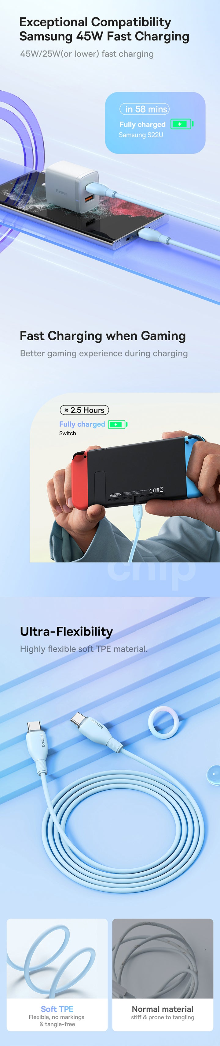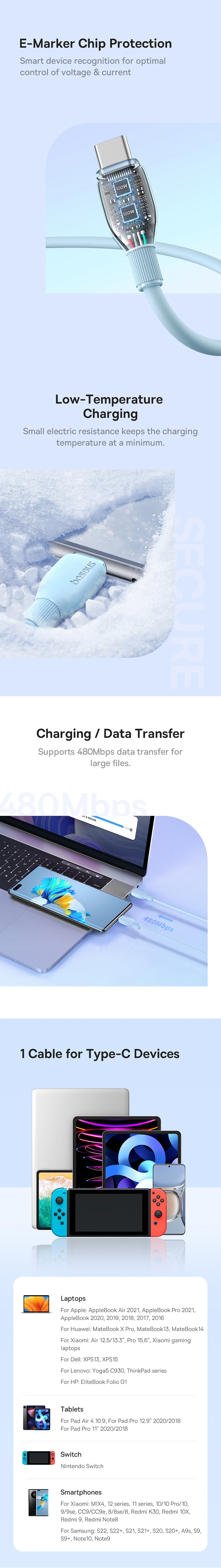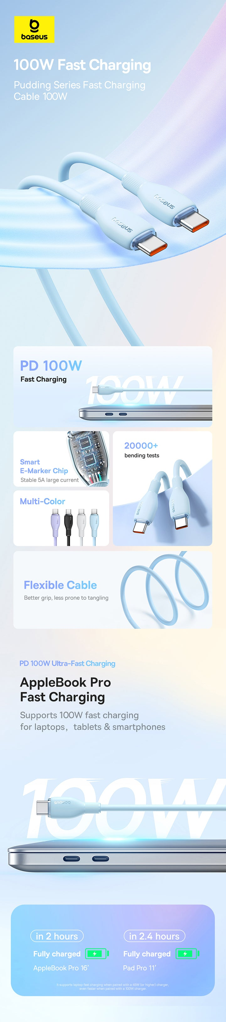 The Baseus Pudding Series 100W USB-C to USB-C Fast Charging Cable combines soft TPE material with powerful charging capabilities. With a 100W output, it quickly charges devices like the MacBook Pro and Samsung Galaxy. The built-in e-marker chip ensures safe charging, and its durable design withstands over 20,000 bends. Compatible with virtually all USB-C devices, it's perfect for both charging and data transfer.