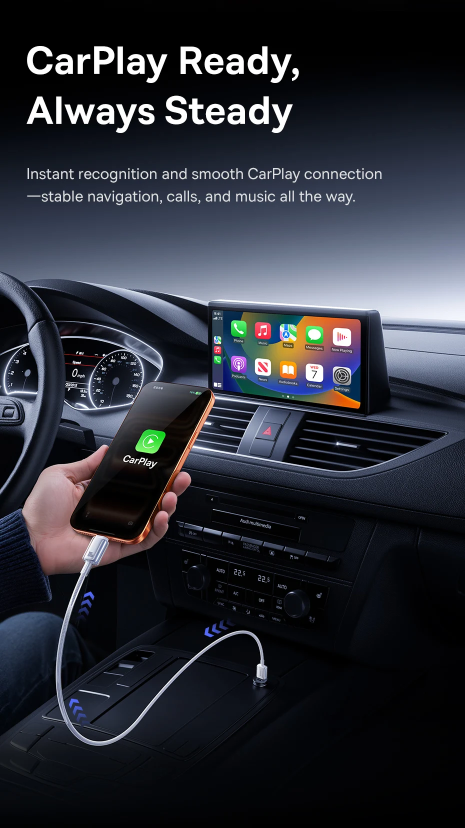 - Stable CarPlay Connection: Ensures instant recognition and a steady link for uninterrupted navigation, calls, and music streaming while driving.