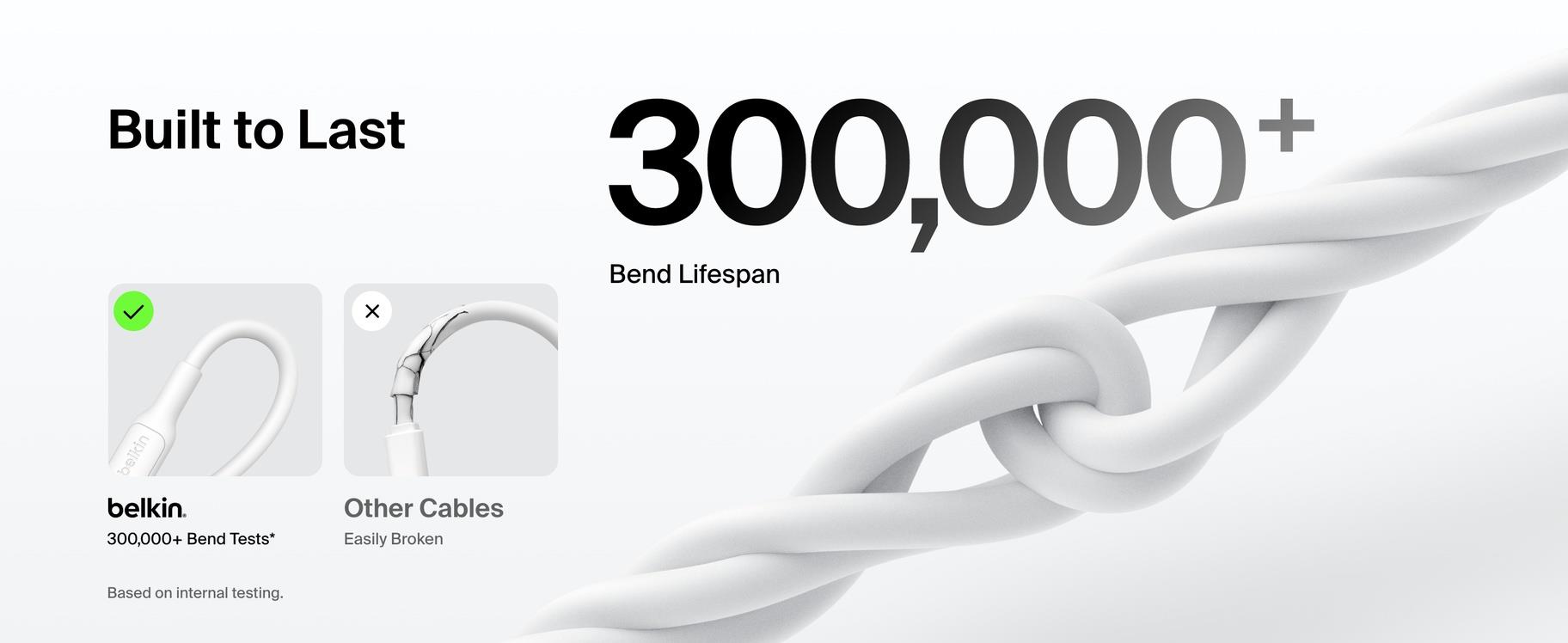 ‡Based on internal bend test at 60°. Based on internal testing. This cable survives 300,000+ bends and 20,000+ plugs, compared with 1,000 bends for an ordinary PVC cable. Actual results may vary.