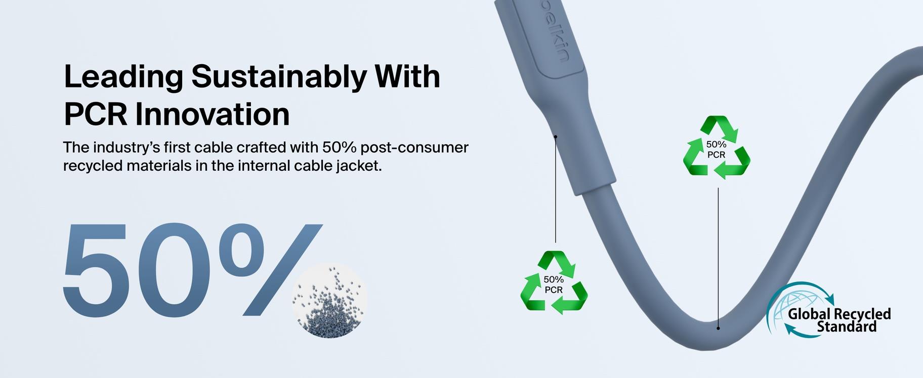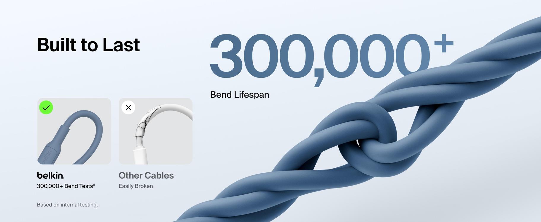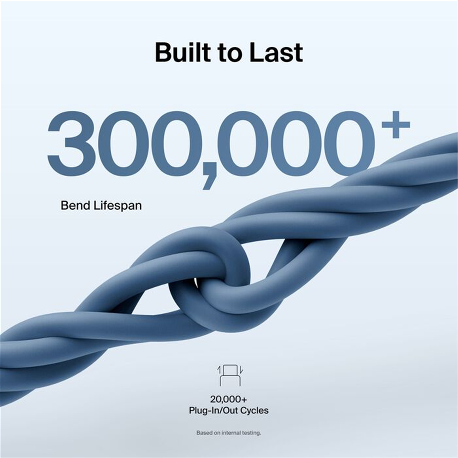 Sustainability meets durability in the new BoostCharge Pro USB-C to USB-C Cable 60W. Fast charge your iPhone 16 from 0-50% in 25 minutes.† Built to last, this PCR cable survives 300,000+ bends and 20,000+ plug ins.‡