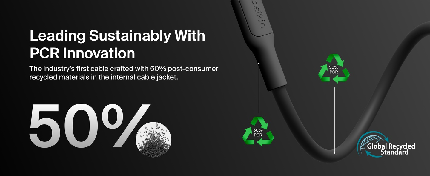****Cable exterior braiding (if applies) is made of 94.5% GRS certified post-consumer recycled polyester, certified by Intertek TE-00121880. Cable head and internal jacket is made of 50% GRS certified post-consumer recycled thermoplastic elastomer, certified by Intertek TE-00112068. Cable manufacturer is a GRS 4.0 listed manufacturer, certified by Intertek TE-00133379.