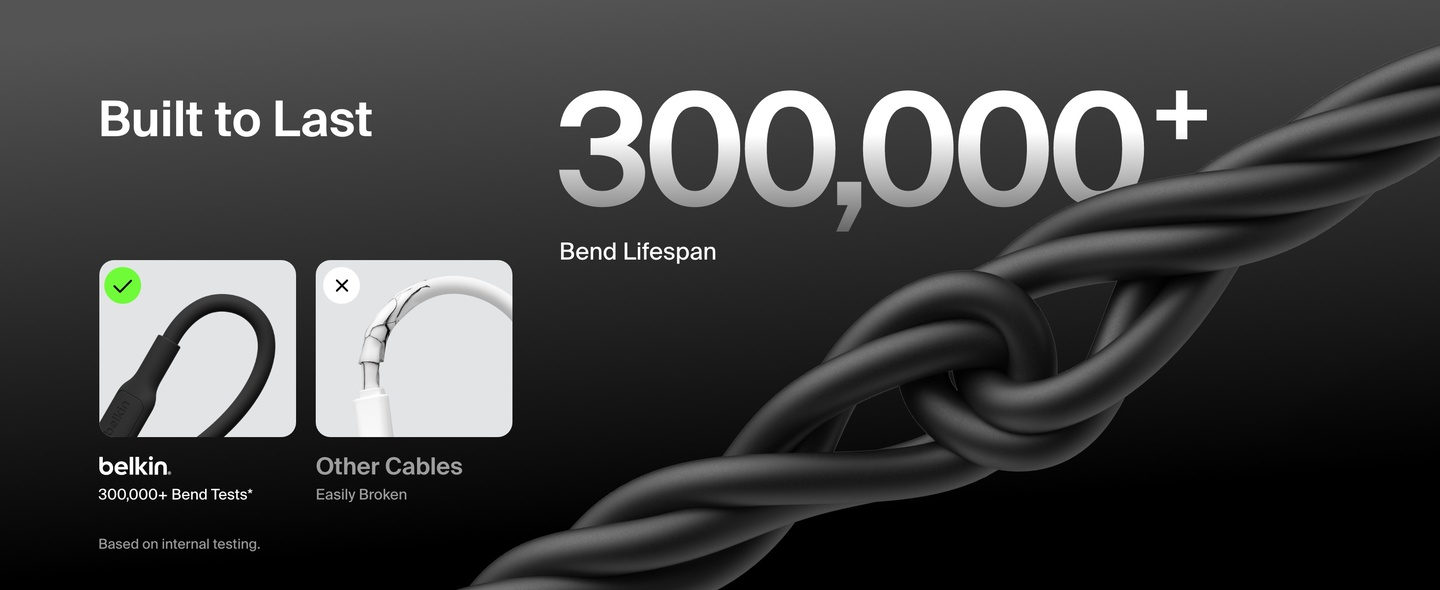 **Based on internal bend test at 60°. Based on internal testing. This cable survives 300,000+ bends and 20,000+ plugs, compared with 1,000 bends for an ordinary PVC cable. Actual results may vary.