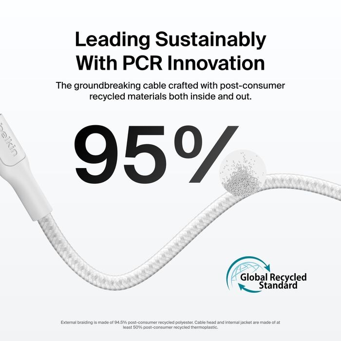 - 95% PCR PET exterior braiding; 50% PCR TPE material in cable boot, strain relief and jacket help to reduce plastic waste without compromising charging performance