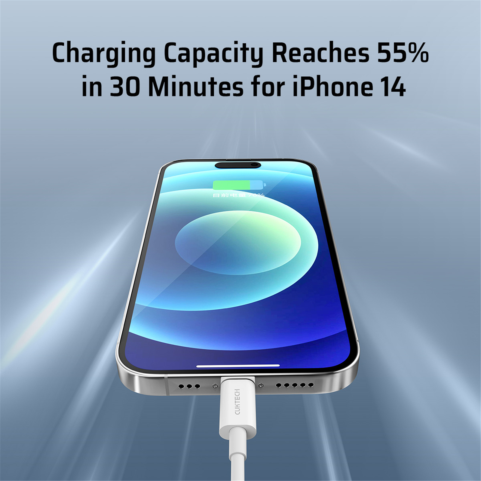 By using the fast charging cable with a CUKTECH charger, you can charge your iPhone 14 to 55% capacity in 30 minutes. This frees you from worrying insufficient power.