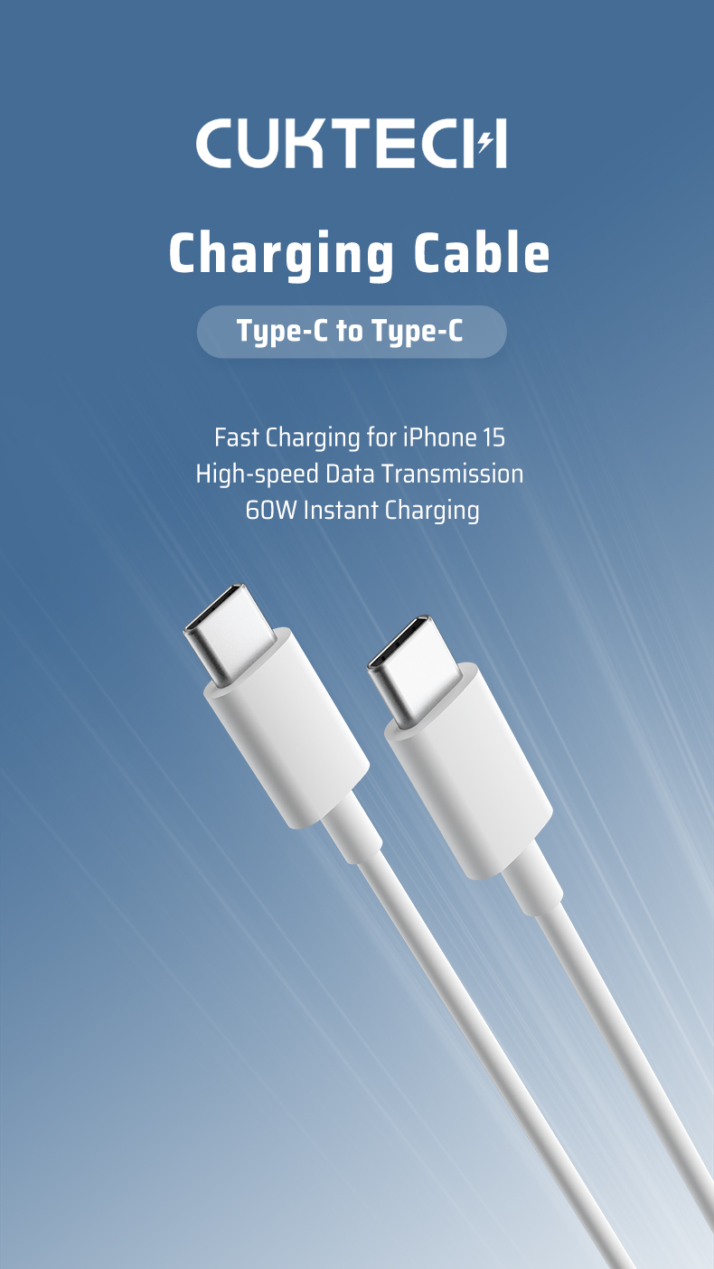 CUKTECH 60W 3A 1.5m USB-C to USB-C Fast Charge Cable - White - Max 60W output - Home, Office, & Bedside Use