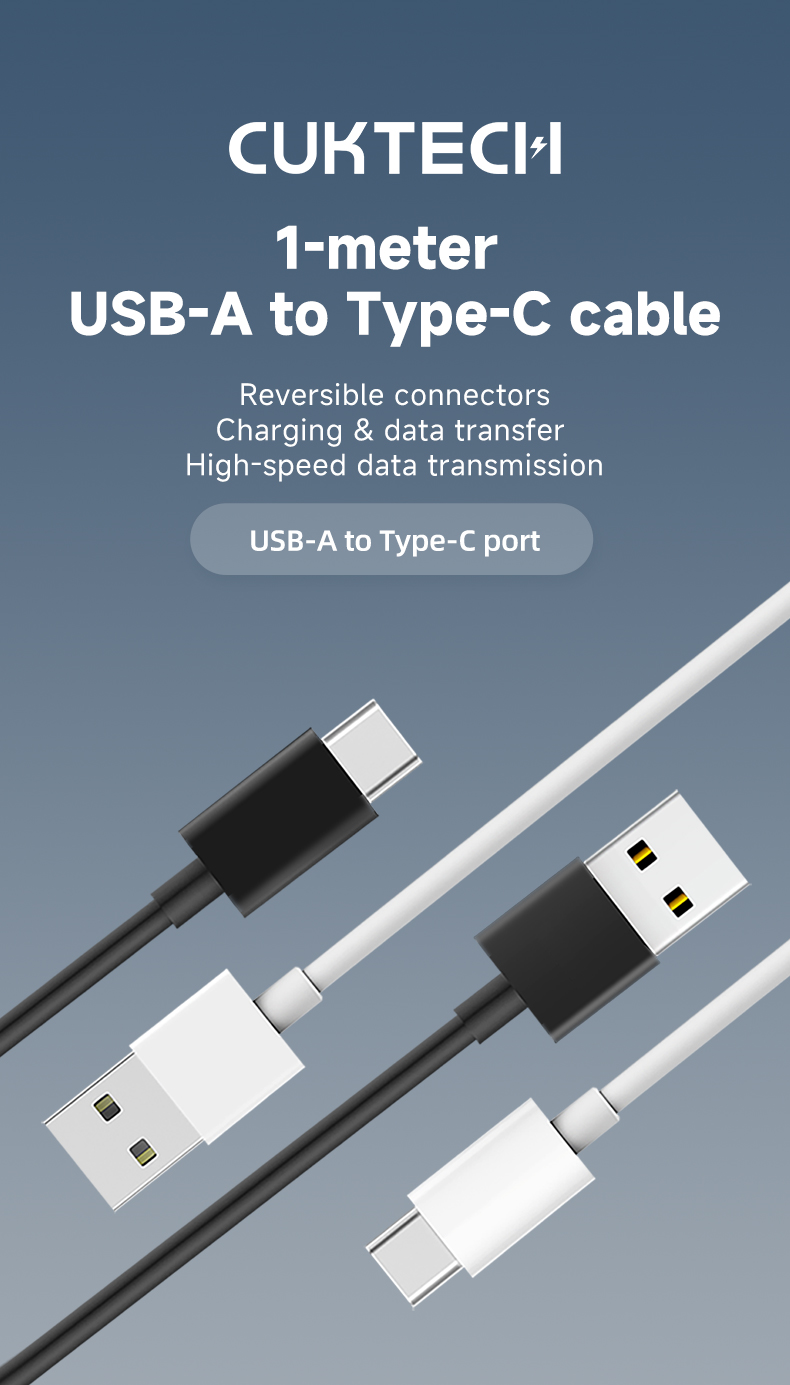 CUKTECH 60W 3A 1m USB-C to USB-A Cable - Black- - Max 60W output -