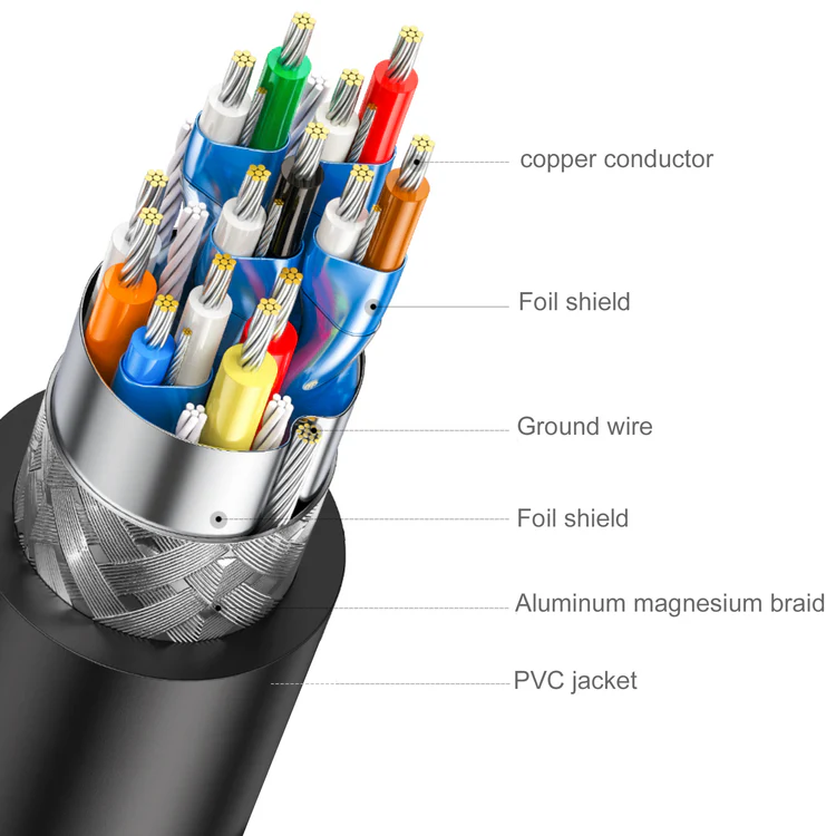 Triple Shielding (individual foil shielding twisted pair, overall Aluminum Magnesium braid shielding and Aluminum foil shielding)