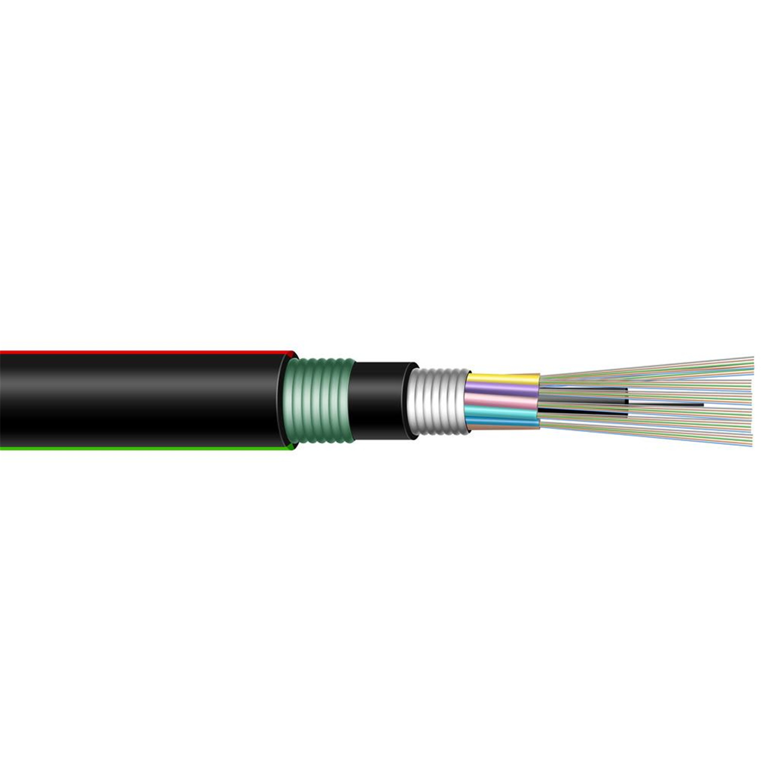 Inner black PE jacket, Corrugated Steel Tape (CST) armouring and final black PE outdoor Jacket