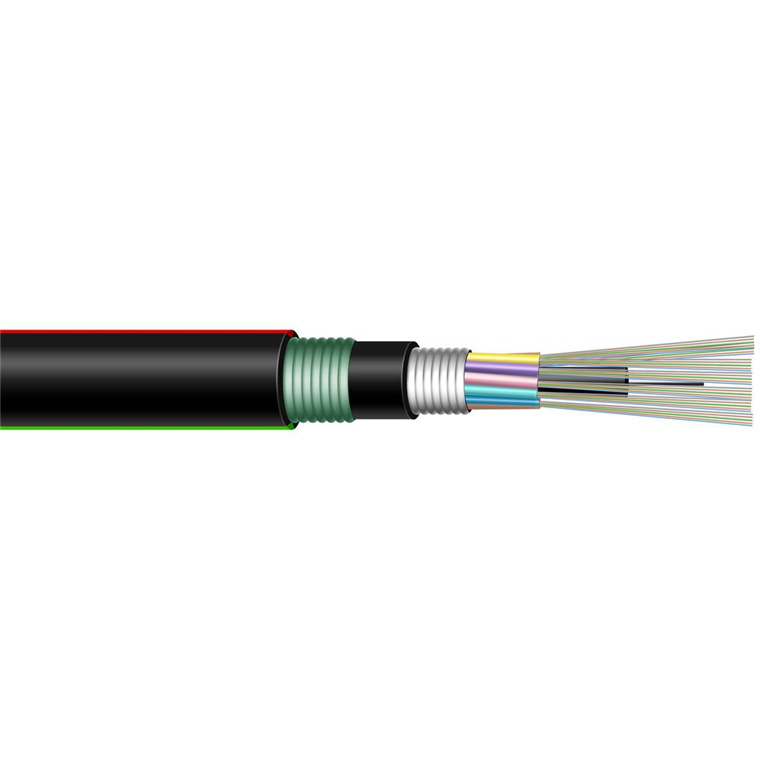 The multi loose tube cable construction consists of 2 to 96, 250µm optical fibres in 6 fibre gel filled loose tubes and fillers where appropriate, SZ stranded around a Fibre Reinforced Plastic (FRP) central strength member. Helically applied water blocking aramid non-metallic strength members. Inner black PE jacket, Corrugated Steel Tape (CST) armouring and final black PE outdoor Jacket.