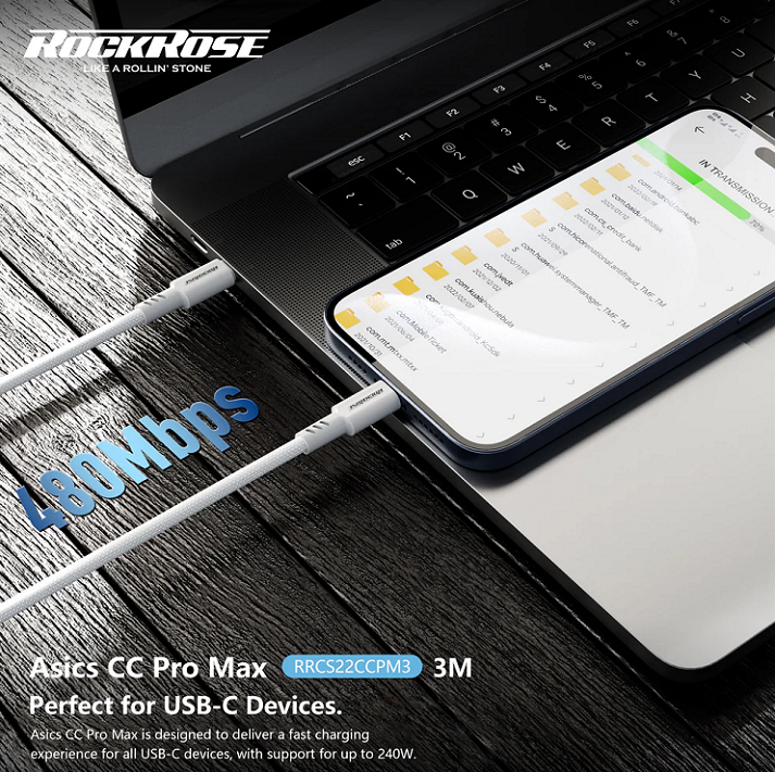 Rockrose Asics CC Pro Max PD240W USB-C to USB-C Fast Charging Cable 3m White