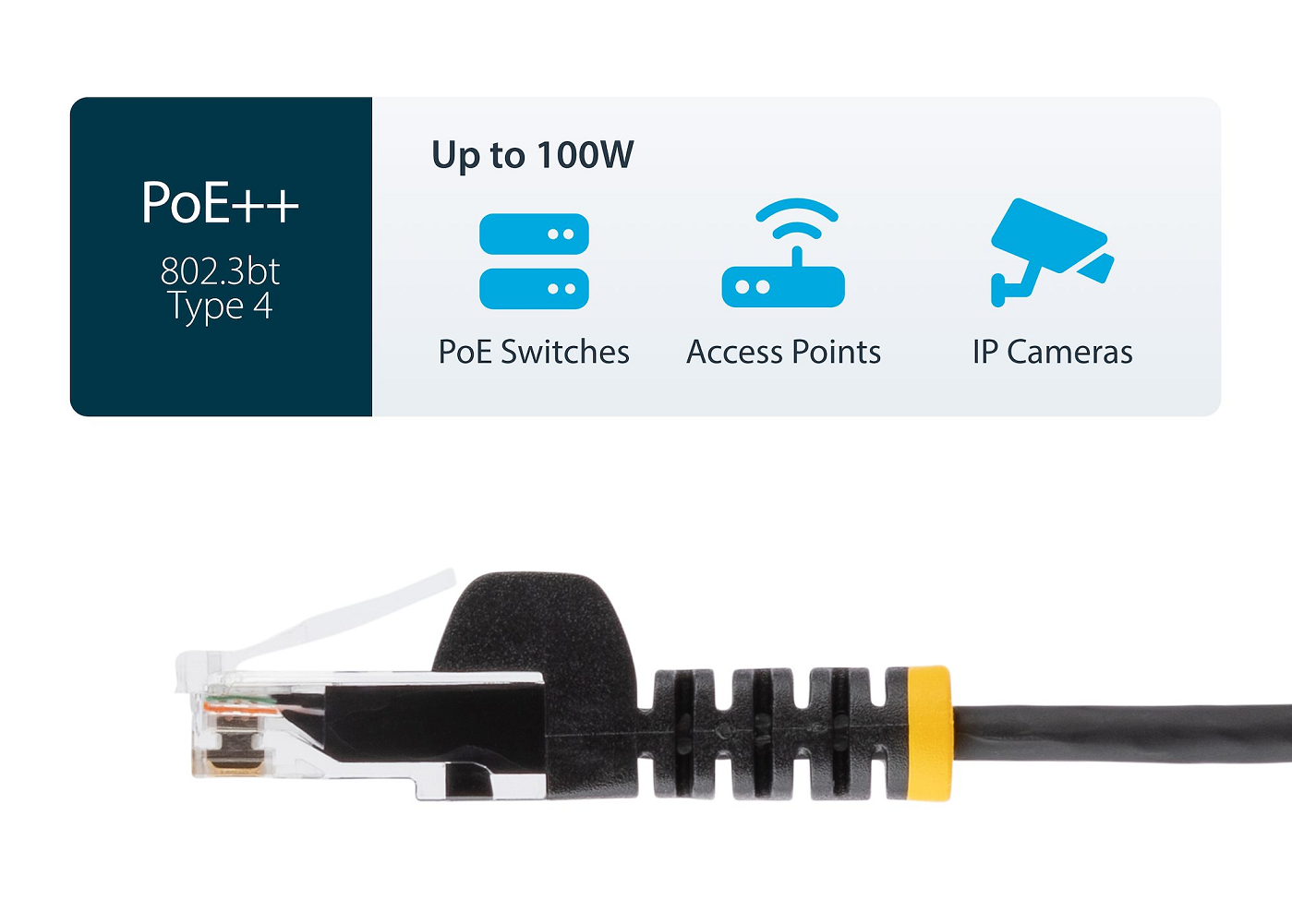 The Slim CAT6 patch cable is tested to comply with ANSI/TIA 568 C.2 requirements for guaranteed Cat6 performance. The cable is Fluke Tested to ensure minimal Near-End Crosstalk (NEXT) and Retun Loss (RL). Reliably deliver up to 100W of PoE++ to power a remote networking devices, including PoE switches and boardroom cameras. This Slim Cat6 Patch Cable complies with IEEE 802.3bt Type 4 PoE++ specifications.